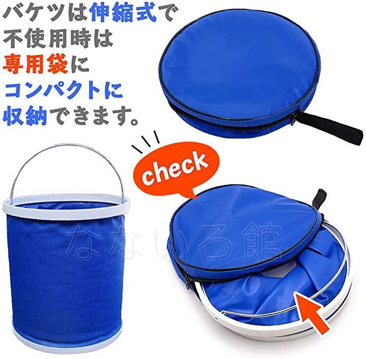 バケツは伸縮式で不使用時は専用袋にコンパクトに収納できます。