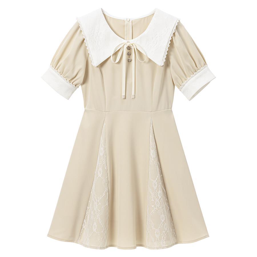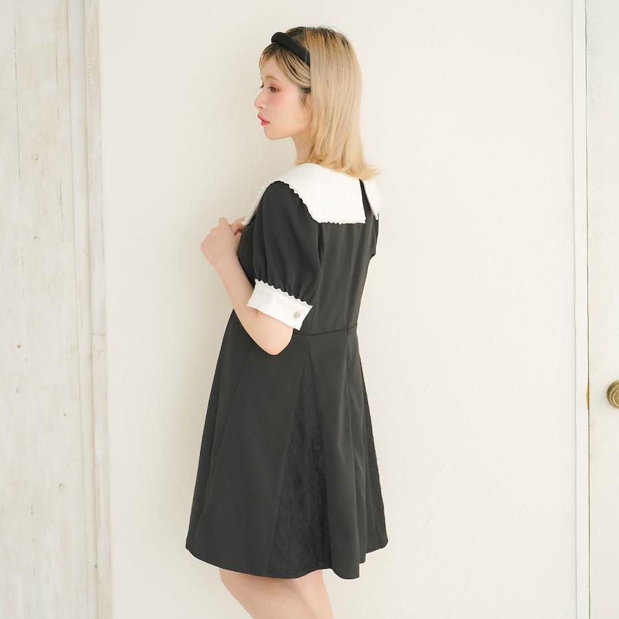 アフタヌーンティーにおすすめ♪上品可愛いワンピースのご紹介。【デザイン】レース切替と大きな角襟が上品な、王道クラシカルガーリーなワンピースです。襟やカフス・スカートのパネル切替えなど、あらゆるところにレースを重ねて上品な雰囲気をプラスしつつ、立体感たっぷりなディテールになっています。付属のグログランテープはご自身で結んでいただく仕様で、取り外し可能です。先端にはシルバーの金具がついており高見えします。前中心とカフスにバラモチーフのシルバーボタンがあしらわれており、ロマンティックな印象に◎後ろファスナーを開閉して着脱する仕様です。1枚で存在感たっぷりなデザインワンピースなので、夏~秋口にかけてピッタリな1枚です!