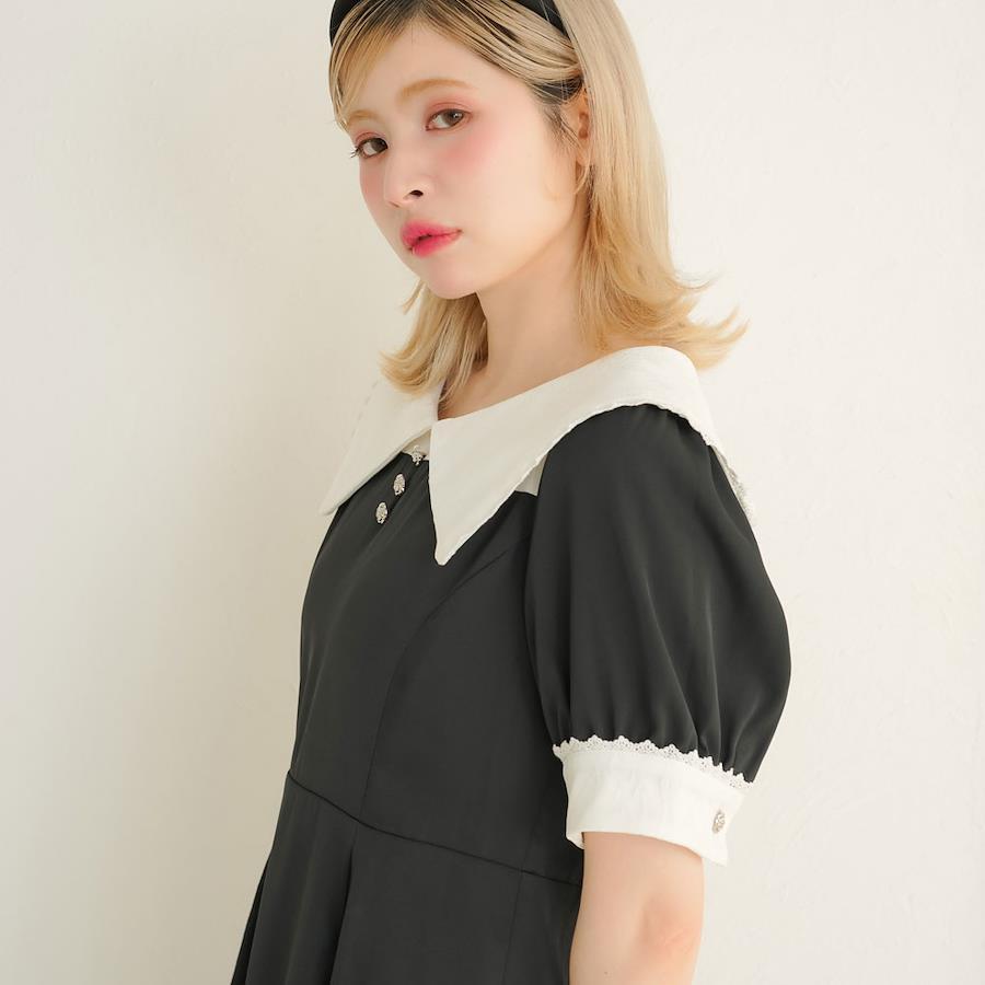 アフタヌーンティーにおすすめ♪上品可愛いワンピースのご紹介。【デザイン】レース切替と大きな角襟が上品な、王道クラシカルガーリーなワンピースです。襟やカフス・スカートのパネル切替えなど、あらゆるところにレースを重ねて上品な雰囲気をプラスしつつ、立体感たっぷりなディテールになっています。付属のグログランテープはご自身で結んでいただく仕様で、取り外し可能です。先端にはシルバーの金具がついており高見えします。前中心とカフスにバラモチーフのシルバーボタンがあしらわれており、ロマンティックな印象に◎後ろファスナーを開閉して着脱する仕様です。1枚で存在感たっぷりなデザインワンピースなので、夏~秋口にかけてピッタリな1枚です!