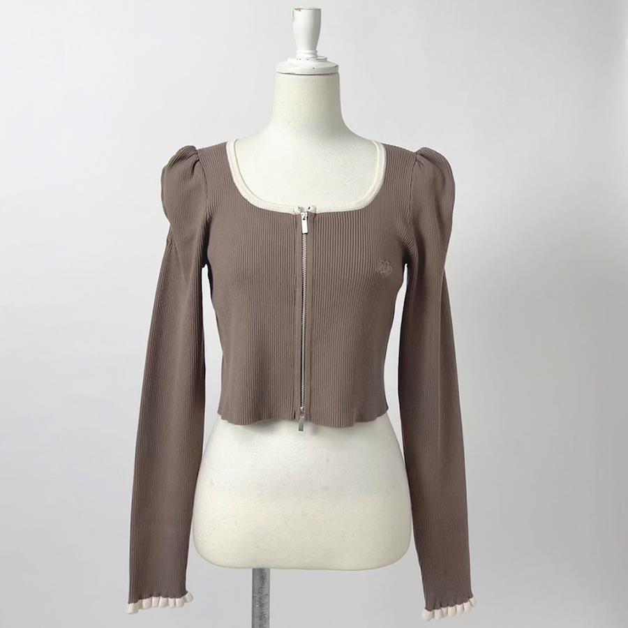 Roseオリジナルロゴ入りダブルジップニットのご紹介。【デザイン】トレンドライクなダブルジップニットが登場!スタイルアップ効果抜群なショート丈でこなれたデザイン◎ジップを閉めてトップスとして着ても、ファスナーを開けてカーデとして着てもOK!配色デザインや、フロントファスナーのシルバーがアクセントに。デコルテが綺麗に見えるスクエアネックで、ネックレスやチョーカーとの相性も◎袖口はちびフリルになっていて、写真に写る手元まで可愛く演出します。新デザインのRoseオリジナルロゴがさりげなく入っており、他とは被らないデザインです!