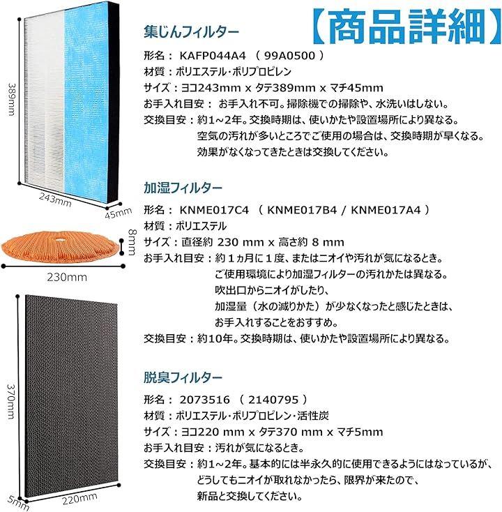 「形名」 集塵フィルター KAFP044A4 ( 99A0500 )/ 加湿フィルター KNME017C4 ( KNME017B4 / KNME017A4 )/ 脱臭フィルター 2073516 ( 2140795 )。