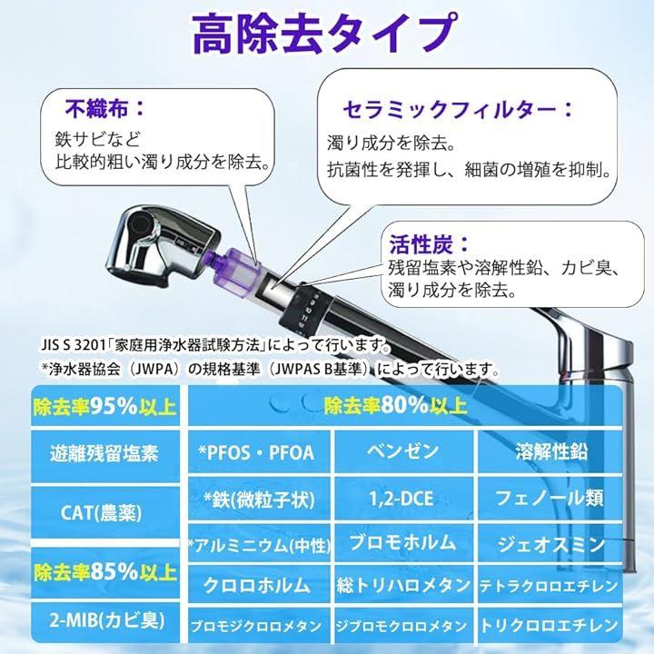 「高除去タイプ」遊離残留塩素、PFOS/PFOA、溶解性鉛、2-MIB(カビ臭)、CAT(農薬)、総トリハロメタン、クロロホルム、ブロモジクロロメタン、ジブロモクロロメタン、ブロモホルム、テトラクロロエチレン、トリクロロエチレン、1.2-DCE、ベンゼン、ジェオスミン、フェノール類、鉄(微粒子状)、アルミニウム(中性)などの物質を除去、水道水を綺麗で美味しい水に変えます。