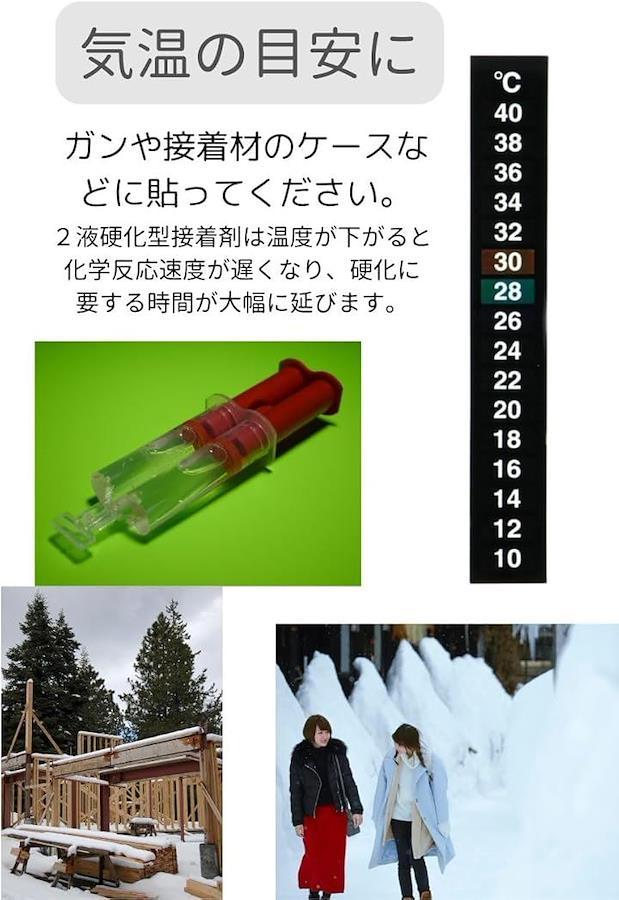 温度シールはカットして使用することができ、ミキシングガンなどに貼れば、低温下で硬化しにくい、2液反応型接着剤にドライヤー、赤外線ランプなどで加熱が必要か判断の目安になります。