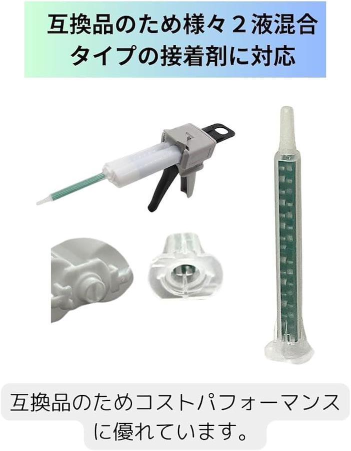 メグミックス、デブコン、メタルグリップ、Grasp、グラスプ、ロックタイト、ウレタンVOICE、3M、セメダイン、メグロ化学など、様々な2液硬化型エポキシ、ウレタン接着剤に使用することができます。