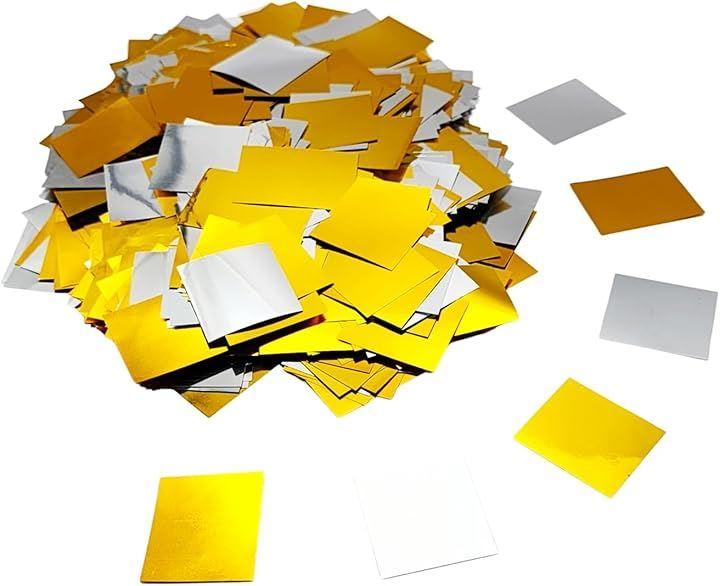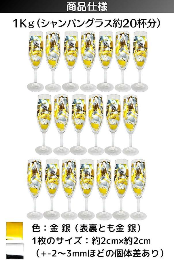 「商品仕様」カラー:金色(リッチなゴールド)・銀色(クロームシルバー) 表裏の両面とも金色・銀色 1枚のサイズ:約2cmx約2cm(+-2~3mmほどの個体差あり) 内容量:1Kg 枚数:約60000枚 材質:PET超薄フィルム