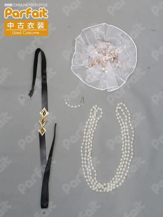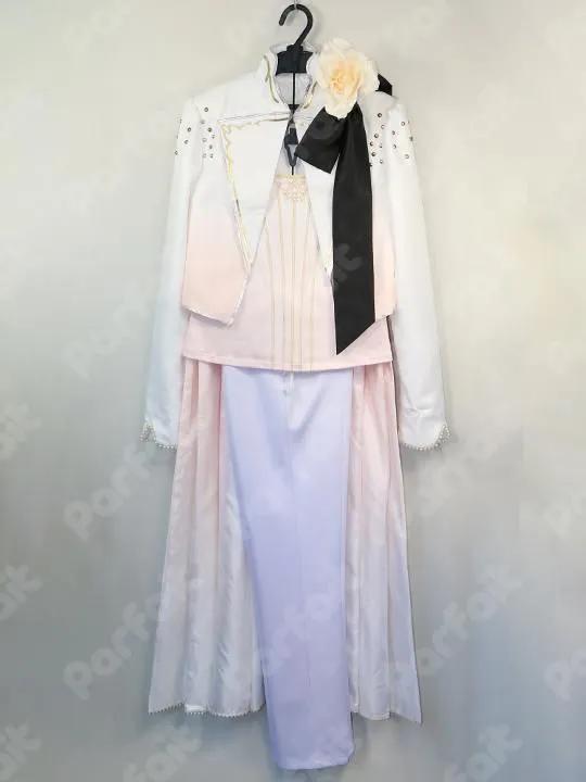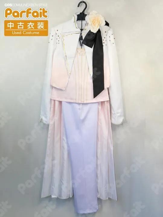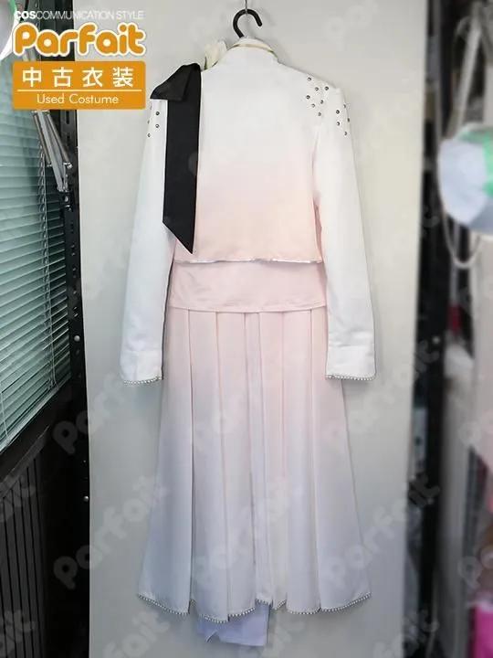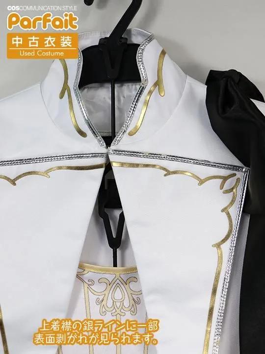 【セット内容】上着、シャツ、ズボン、腰布、首パール飾り、肩リボン、肩花飾り、腰ベルト、パールチェーン、髪飾り【生地の種類】ポリエステル【コメント】イベント「スカウト!薔薇の庭園で」の白衣装です。手袋と一部のパールチェーンがありません。ズボンとシャツは伸縮生地で作られており柄は昇華プリントです。腰布は腰紐とズボン内側のマジックテープで着脱します。ベルトや金銀ラインは合皮製で、上着襟の銀ラインに一部表面剥がれが見られます。(2025/11時点)