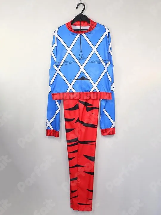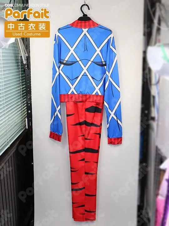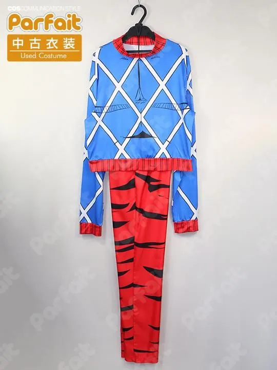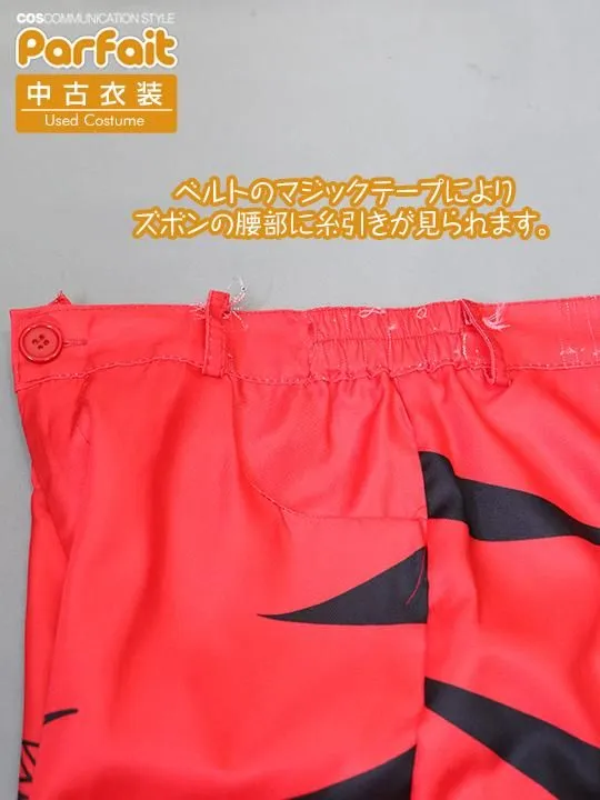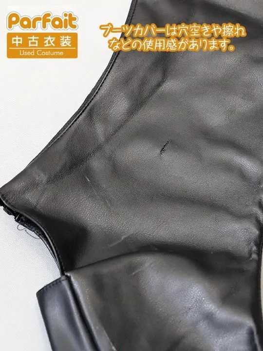 【セット内容】Tシャツ、ズボン、ベルト、ブーツカバー、帽子【生地の種類】ポリエステル【コメント】やや使用感のある通常衣装です。衣装柄は昇華プリントで再現されています。Tシャツは薄手の伸縮生地で袖や裾にうっすらと丈詰め加工をほどいた跡があります。ズボンはウエストに一部ゴムが入っており、ベルトのマジックテープによりズボンの腰部に糸引きが見られます。ベルトは合皮製で状態は比較的良好です。ブーツカバーの合皮は側面や底部に穴空きや擦れなどの使用感があります。(2026/3時点)