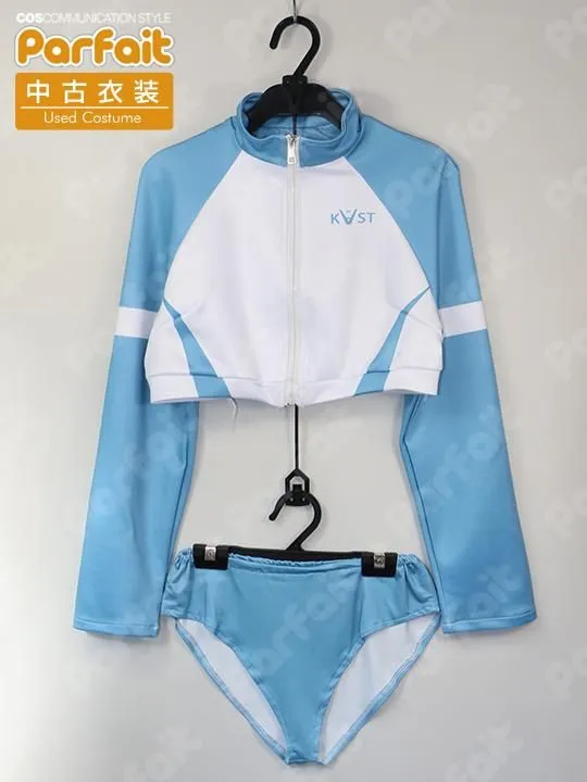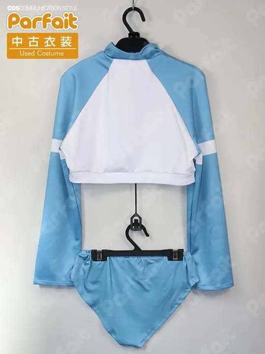 【セット内容】上着、ショーツ、帽子【生地の種類】ポリエステル【コメント】比較的状態の良い水着衣装です。主に伸縮するジャージ系生地が使われています。胸の文字はプリントです。ボトムは履き口にゴムが入っています。上着の背面首付近に若干縫製吊りがあります。