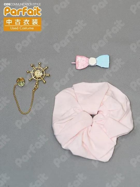 【セット内容】ワンピース、襟ピンズ、シュシュ、靴下【生地の種類】ポリエステル【コメント】比較的状態の良いセーラー服風衣装です。ワンピースのスカート部は柄生地で、脇ファスナーで着脱します。三角襟部分はスナップボタンです。袖口にはゴムが入っています。セーラー服の白地がうっすらとピンク色がかっています。