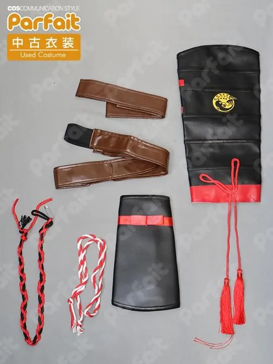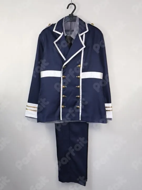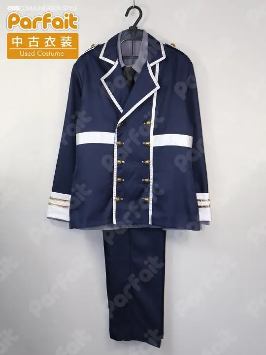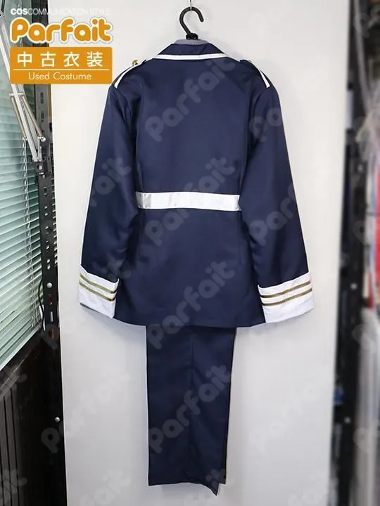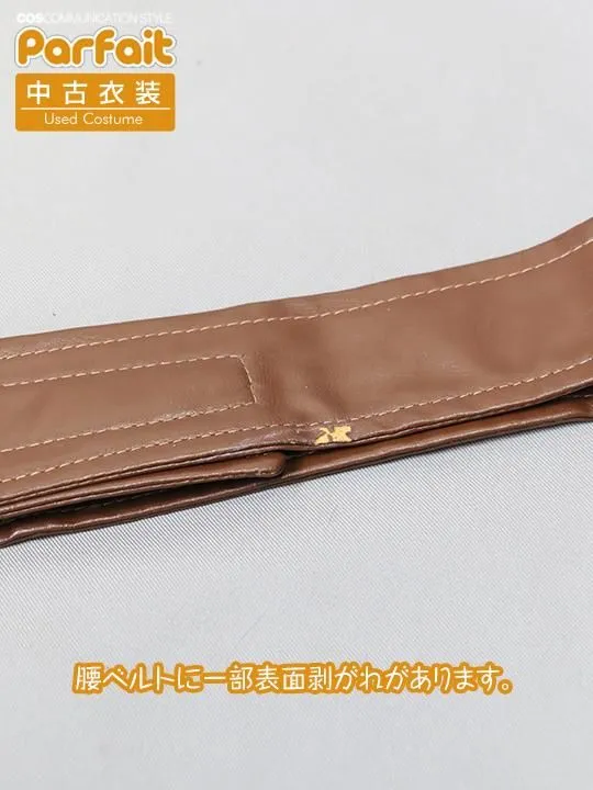 【セット内容】上着、ブラウス、ズボン、ネクタイ、腰ベルト、胸ベルト、胸紐、肩防具、腕防具、ウィッグ【生地の種類】ポリエステル【コメント】ウィッグが付属した通常衣装です。バスト約100cmウエスト約73cmで女性L-XLサイズ相当です。ズボンの腰部に縫製を引っ張った跡があり、ズボンのファスナーは一部引っかかりやすい箇所があります。上着の左袖に黒線のような汚れがあります。上着の金ラインやベルト・防具は合皮製で状態は比較的良好ですが、腰ベルトに一部小さな表面剥がれがあり、肩防具の折れ目に一部使用感が見られます。(2026/3時点)ウィッグはクラッセ製で前髪やサイドの毛髪などにカット加工があります。