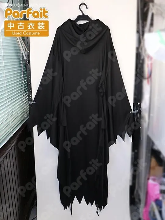 【セット内容】ローブワンピース、帯紐、お面【生地の種類】ポリエステル【コメント】比較的状態の良い黒のローブ衣装です。身幅約74cmです。薄手の柔らかいポリエステル生地が使われています。フード周りにはキルト芯が入っています。お面は硬質のプラ系素材で作られており、フチ付近にいくつか小さな穴が空いています。