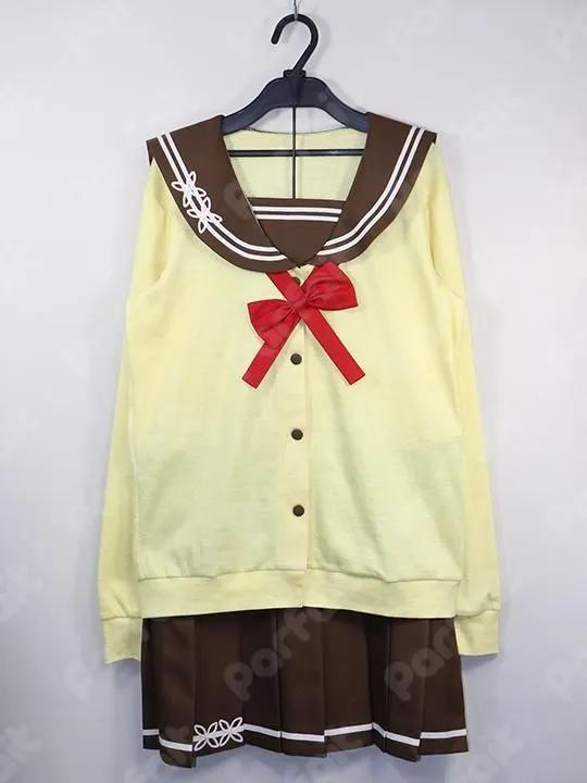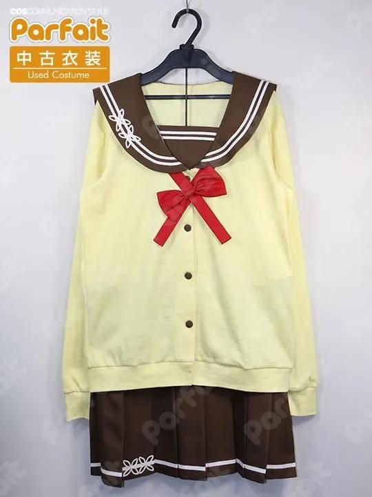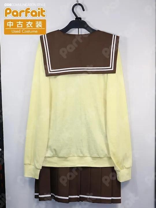 【セット内容】セーラー服型セーター、ブラウス、スカート、首リボン、靴下【生地の種類】ポリエステル【コメント】御船流子用のセーラー服型セーターと藤和エリオ用のブラウスが付属した、比較的状態の良い制服衣装です。バスト約96cmウエスト約83cmです。トップスはニットセーターにセーラー襟が付いた形状です。襟やスカート裾の模様はリボンテープ縫い付けで再現しています。首リボンはループ紐式で、リボン裏のスナップボタンで着脱します。ブラウスは首元にボタンがない開襟の形状です。