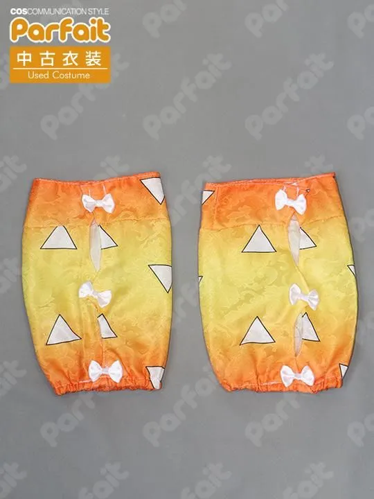 【セット内容】羽織、脚カバー【生地の種類】ポリエステル【コメント】使用感のない羽織と脚カバーのみのセットです。羽織の身幅約53cmです。薄手のポリエステル生地で作られており、衣装柄は柄布に昇華プリントで再現されています。脚カバーは上部のスナップボタンで着脱します。