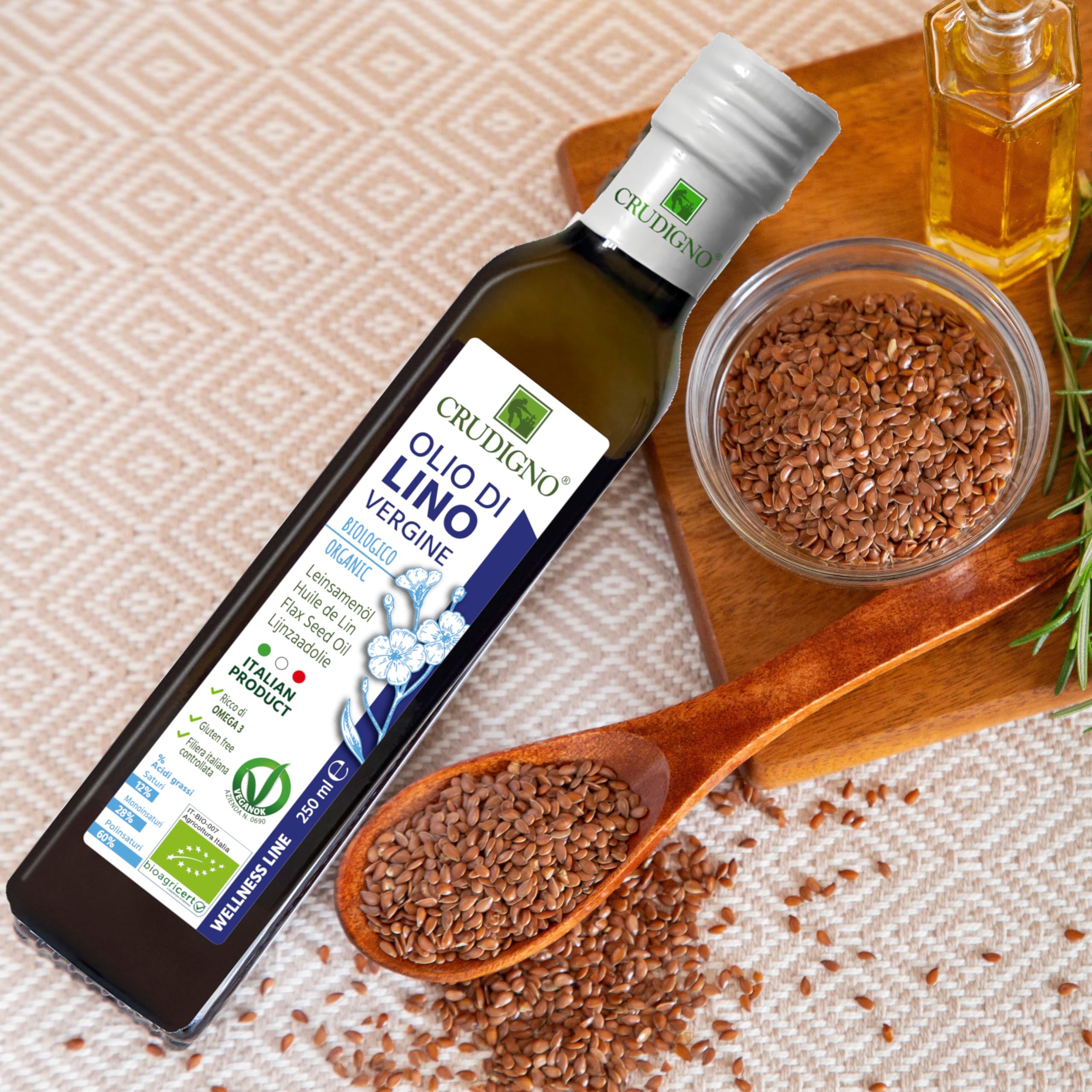 主にイタリア産・EU産の100%有機亜麻の種子だけででできたオーガニックフラックスオイル(有機亜麻仁油)になります。