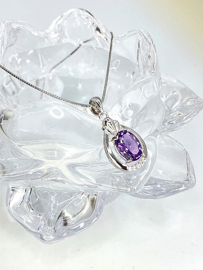 ペンダントのデザインに合わせてお色味が薄めで透明感のあるクリスタルカラーのアメジストですので、どっしりとした深い色合いのアメジストをお好みの方はご注意ください。