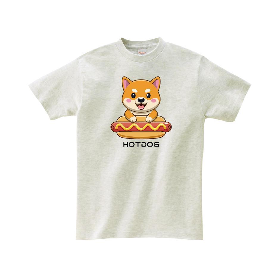 ホットドッグを食べようとしているかわいい柴犬のTシャツです。※画像ははめ込み画像となり、実際とは多少異なりますので予めご了承ください。 ※サイズ表をよくご確認の上ご購入ください。 ※受注生産となるため、返品、交換はご遠慮ください。
