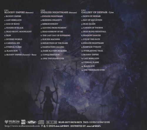 disc-3『GALLERY OF DESPAIR - LIVE』01. DAWN OF DESPAIR02. DAY OF SALVATION03. DEAD AGAIN04. GARDEN OF THORNS05. DEAD BLIND NIGHTFALL06. SHADOW DANCER07. EYE OF THE HATE08. ENDLESS NIGHTMARE09. RAMPAGE TYRANT10. EVERLASTING TRAIL11. BLOODY EMPIRE12. LAST REBELLION13. ETERNAL FLAME14. BLACK SUN15. ONE THOUSAND EYES