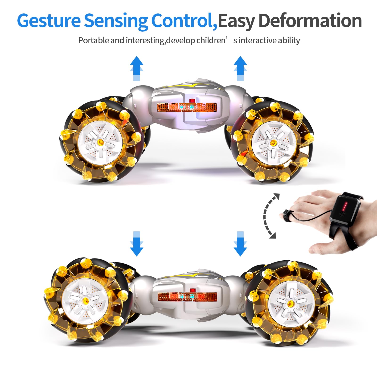 ラジコンスタントカー スマートリモートコントロールモード: リモコンは2.4GHz伝送技術を採用しており、コントロールと超長距離コントロールに敏感です。 さらに素晴らしいリモコンウォッチ。 時計を手につけて姿勢を変えると、変形可能な車は姿勢の変化を感知し、運転や変化を自由に感じることができます。 【オフロードマルチローラータイヤ】独自のローラートラクションタイヤを搭載した4WD RCモンスタートラックです。 オフロードモードは、砂、草、汚れ、岩など、あらゆる地形に対応します。 クレイジーなスタントとクールな特徴: 1:12スケールのリモートカーは全方向に移動でき、360°回転と両面運転が可能で、4輪駆動のクライミングスタントカーは光と音楽効果があり、両側で移動できます。 クールな機能と無限の楽しみが、子供たちに素晴らしい操作体験と視覚効果をもたらします。 付属の安全な充電式バッテリー: 車には充電式アップグレード3.7V(1300mAh)バッテリーを搭載し、耐久性が長持ちする大容量の高速パワーバッテリーです。 2時間の充電で50~60分使用できます。 リモコンには「1.5V」の単三電池が2本使用されています (別売り)。 最高のギフトアイデア: 2.4G スタントジェスチャーセンシング ツイストバギー ライト、音楽、ドリフトトラバーサス、リモコン、ダンス、その他、男の子や女の子へのクリエイティブな誕生日パーティーギフト、子供への新学期のギフト、ハロウィン/クリスマス/子供の日のギフトやストレス解消おもちゃ。