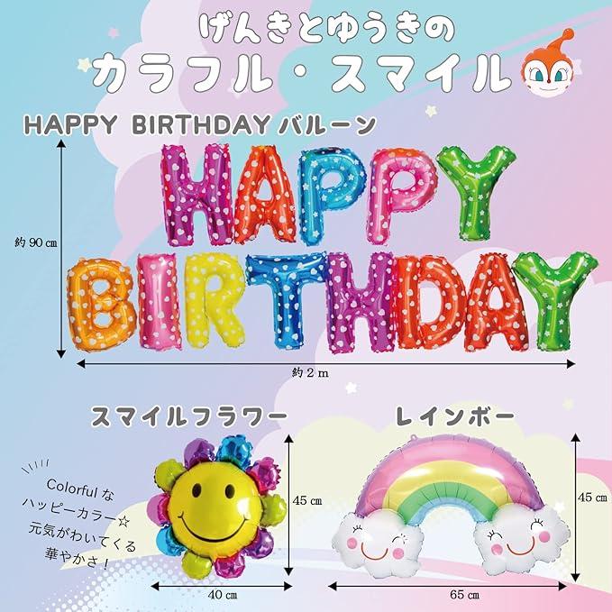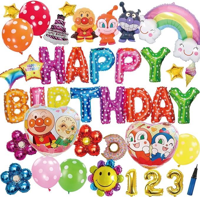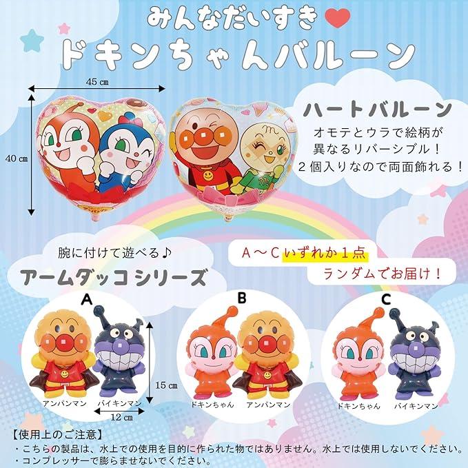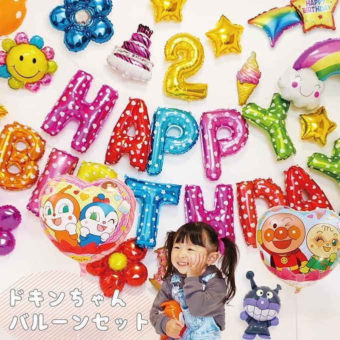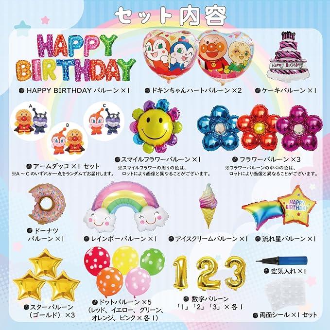 ■商品説明【セット内容】HAPPY BIRTHDAYバルーン×1、ドキンちゃん ハートバルーン×2、アームダッコ×2、レインボーバルーン×1、スマイルフラワーバルーン×1、フラワーバルーン×3、ドーナツバルーン×1、アイスクリームバルーン×1、ケーキバルーン×1、流れ星バルーン×1、スターバルーン×3、ドットバルーン(レッド、イエロー、グリーン、オレンジ、ピンク×各1)、数字バルーン「1」「2」「3」×各1、両面シール×1セット、空気入れ×1 ※サイズ等詳細につきましては商品の説明をご覧ください。 【1歳、2歳、3歳の誕生日に特におすすめ!】とってもカラフルで元気が出る「ドキンちゃん バルーンセット」です!さらに、かわいいスイーツバルーン、星や花のバルーンなどなど、このセットだけで華やかなお誕生日の飾り付けが完成します。男の子も女の子も大喜びすること間違いなしのドキンちゃん風船セットです☆ 【みんな大好きドキンちゃん】ドキンちゃんのハートバルーンが2個と、抱っこちゃん人形が2個入ったボリュームセット♪ハートバルーンはオモテとウラで絵柄が異なるリバーシブル!ウラにはアンパンマンとメロンパンナちゃんも。バースデーパーティーはもちろん、おうちスタジオでのバースデーフォト、記念撮影の飾り付けにもご活用いただけます。お子さまのハーフバースデーやファーストバースデー、サプライズにもおすすめです。人気のフィルムバルーンがたくさん入った飾りセットです。 【飾りに便利なグッズ付き♪】お誕生日パーティーにはマストのHAPPY BIRTHDAYバルーン、フラワーやレインボー、スターバルーン、スイーツのバルーンといった飾りアイテムが盛りだくさん!さらに、40センチの「1」「2」「3」の数字バルーンが各1個と、風船にスピーディーに空気が入れられる手動式の空気入れまでセットになっています。このセットだけで必要なものが揃うため、バースデーパーティーの準備は簡単です。※空気が入っていない状態でのお届けとなります。 【安心の30日保証】商品が届いてから30日間は返品・返金を承ります。商品の品質には万全を期しておりますが、商品の不備や配送中の破損、または注文内容が異なる場合はカスタマーセンターまでご連絡ください。 代替品がご使用日までに間に合いますよう、お日にちに余裕を持ったご注文と商品到着後すぐに空気を少量入れて穴あきなどの問題がないかお客様にてチェックをお願いいたします。ご協力をお願いいたします。?もっと見る