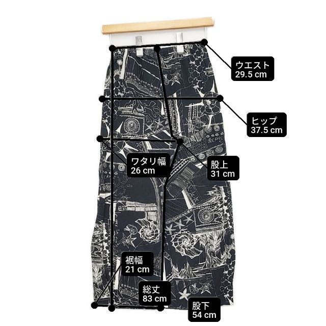 | 実寸サイズ | 総丈:約83cm ウエスト:約29.5cm ウエスト最長:約42cm 股上:約31cm 股下:約54cm ヒップ:約37.5cm ワタリ幅:約26cm 裾幅:約21cm ※採寸画像がある商品はハンガーに吊るした状態での計測のため、平置きでの採寸とは差が生じる場合がございます。平置きでの実寸サイズをご希望の場合は、ご購入前に必ずご質問ください。 ※記載以外のサイズが合わないことを理由とした返品はできませんので、 記載部分以外で実寸サイズの気になる箇所があれば必ず購入前にご質問ください。 |