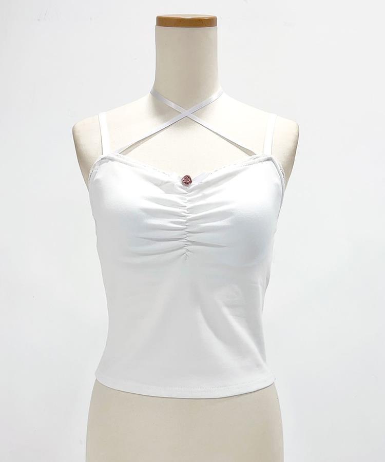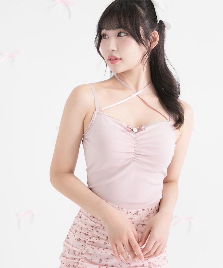 キャミタイプのホルターネック紐はクロスして後ろでリボン結びしても可愛いし、前に垂らしてチョーカー風にしてもOK!