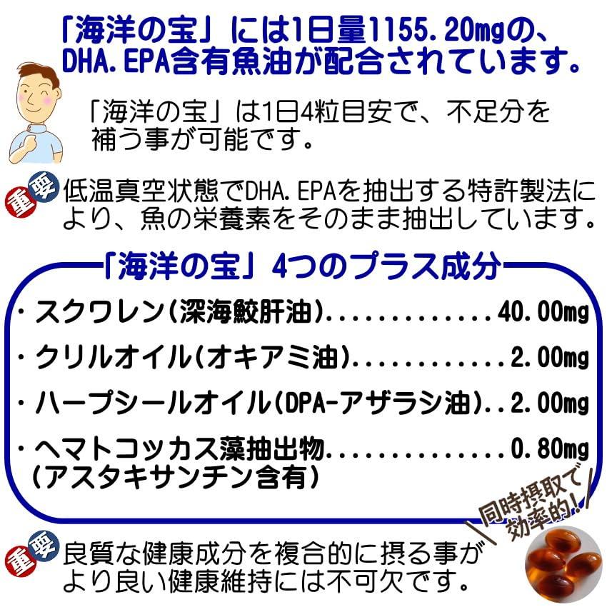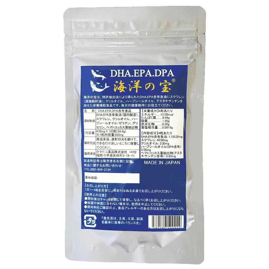 ■サイズ:??21.5x11.5x1.3cm;60g 初回お一人様3個までのお試し価格です。リピートの方にはお得なセットなどもご用意しております。 「海洋の宝」などで検索していただければ全シリーズが表示されます。 1日量(4粒中)に1155.2mgの DHA.EPA 含有魚油を配合! 「海洋の宝」は創業100年の佐賀県の老舗 製薬会社 が製造した、DHA.EPA が豊富に詰まった フィッシュオイル の サプリメント です。 「海洋の宝」は、特許製法 により得られた DHA.EPA 含有魚油に ハープシールオイル ( アザラシ油 DPA )、スクワレン 、クリルオイル、アスタキサンチン を加えたハイブリッドな 栄養補助食品 です。 プライベートブランドで直売ですのでハイクオリティーな商品がリーズナブルです。 【お召し上がり方】1日1粒~4粒を目安に、水又はぬるま湯でお召し上がりください。 【内容量】120粒(56.4g) ※1粒重量470mg ※1粒内容量300mg (内DHA EPA含有魚油288.8mg) ★ 合成保存料、合成着色料 などの 添加物 は 無添加 です。また ソフトカプセル 内には有用成分以外は一切使用しておりません。 ■重要なお知らせ