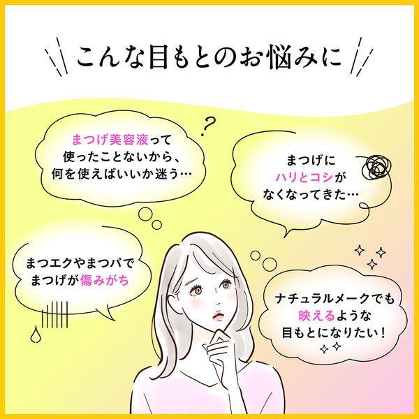 まつげのダメージをケアし、美しく、つややかに。つや、ハリ、コシ。1本で、まつげに自信!●まつげエクステの上からも使用OK。●トリートメント効果。6種の植物エキスやプラセンタエキスなどの皮膚コンディショニング成分を配合。マスカラやビューラー、紫外線による乾燥などでダメージを受けやすいまつげに、ハリとうるおいを与え、つややかに輝く自信の美まつげへ整えます。●むらなく塗れる。美容液をたっぷりとらえる、スクリュー型のブラシを採用。まつげ1本1本にむらなく塗布できます。●目もとにやさしい。デリケートな目もとに配慮した弱酸性。●24時間、まつげケア。・おやすみ前に:お手入れ用として。・お出かけ前に:マスカラ下地として。・お出かけ先で:透明マスカラとして。●無香料・無着色・パラベンフリー。