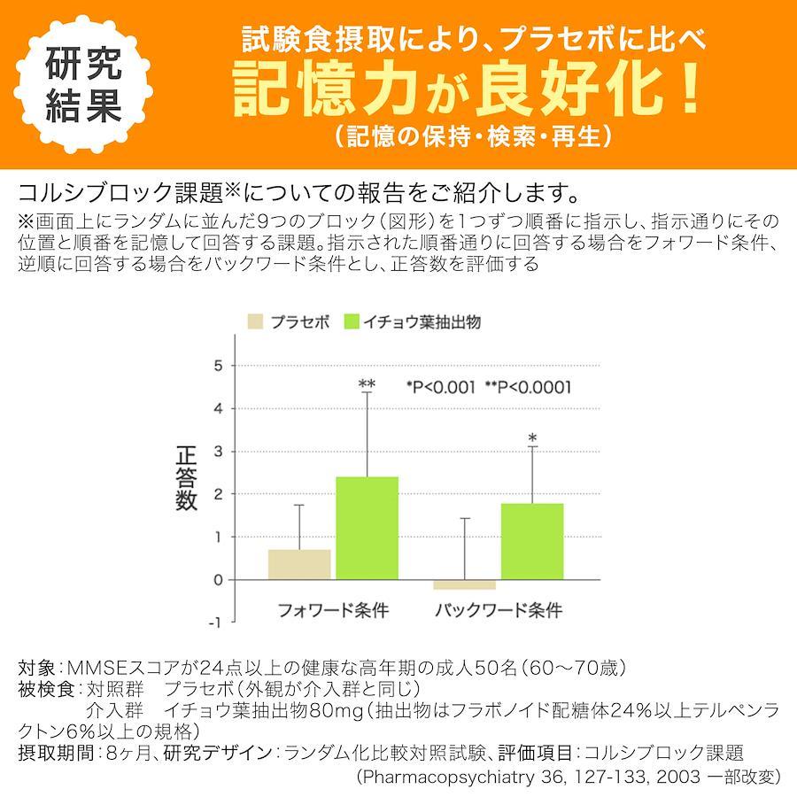 本品にはイチョウ葉由来フラボノイド配糖体、イチョウ葉由来テルペンラクトンが含まれます。イチョウ葉由来フラボノイド配糖体、イチョウ葉由来テルペンラクトンには加齢によって低下する脳の血流を改善し、認知機能の一部である記憶力(言葉・物のイメージ・体験を覚え、思い出す能力)の維持や判断の正確さを向上させることが報告されています。摂取の方法