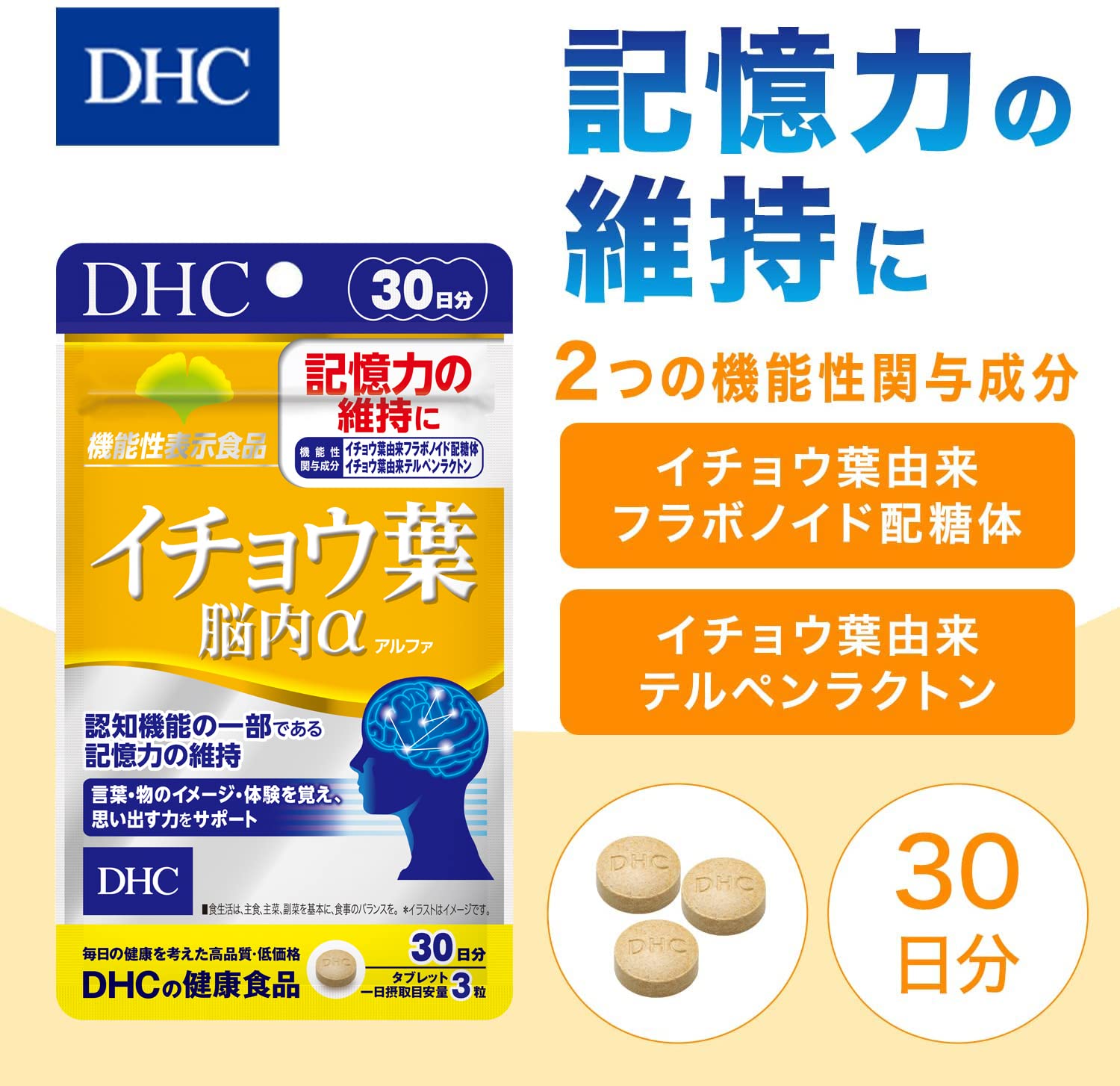 イチョウ葉由来の機能性関与成分2種で、脳の血流を改善し、記憶力の維持を!『イチョウ葉 脳内α(アルファ)』は、機能性関与成分[イチョウ葉由来フラボノイド配糖体]を1日摂取目安量あたり43.2mg、[イチョウ葉由来テルペンラクトン]を1日摂取目安量あたり10.8mg配合した【機能性表示食品】です。[イチョウ葉由来フラボノイド配糖体]と[イチョウ葉由来テルペンラクトン]は加齢によって低下する脳の血流を改善し、認知機能の一部である記憶力の維持や、判断の正確さの向上に役立つことが報告されています。「昨日の夕食が思い出せない…」「あの人の名前、なんだったっけ…」「私、何をしようとしてたんだっけ…」など、言葉や物のイメージ・体験を覚え、思い出す能力に不安を感じ始めた方の記憶力や判断力をサポートします。