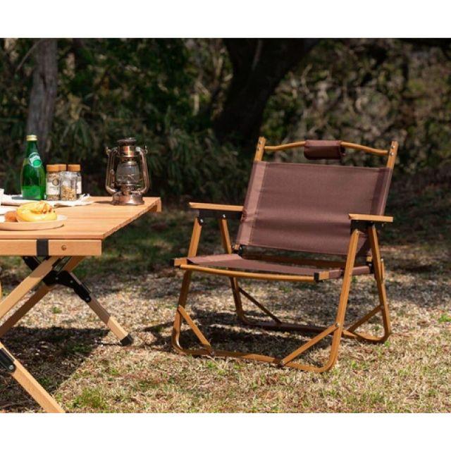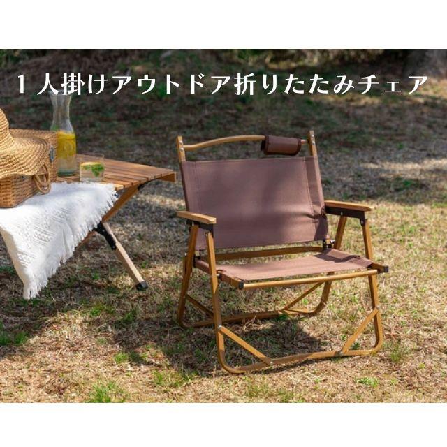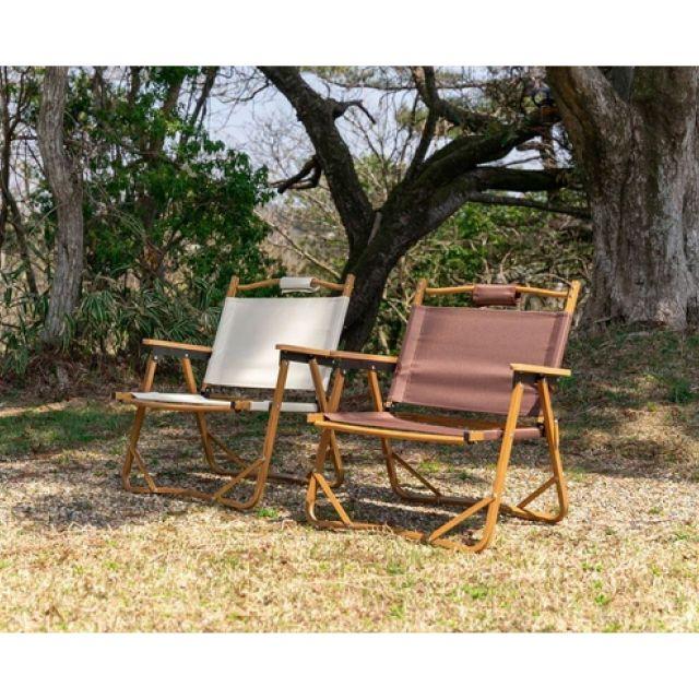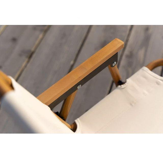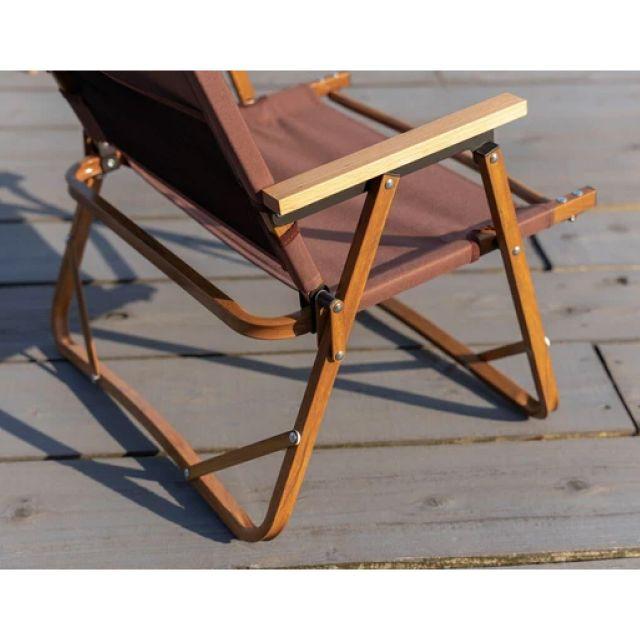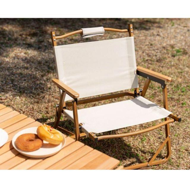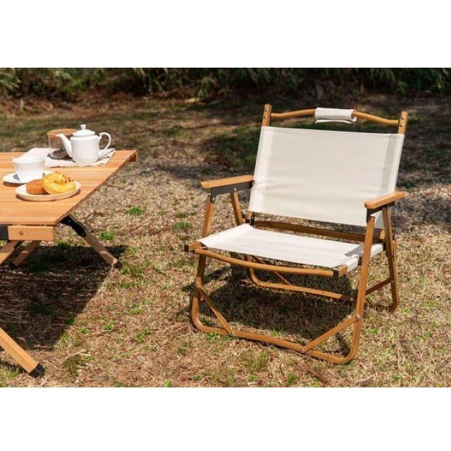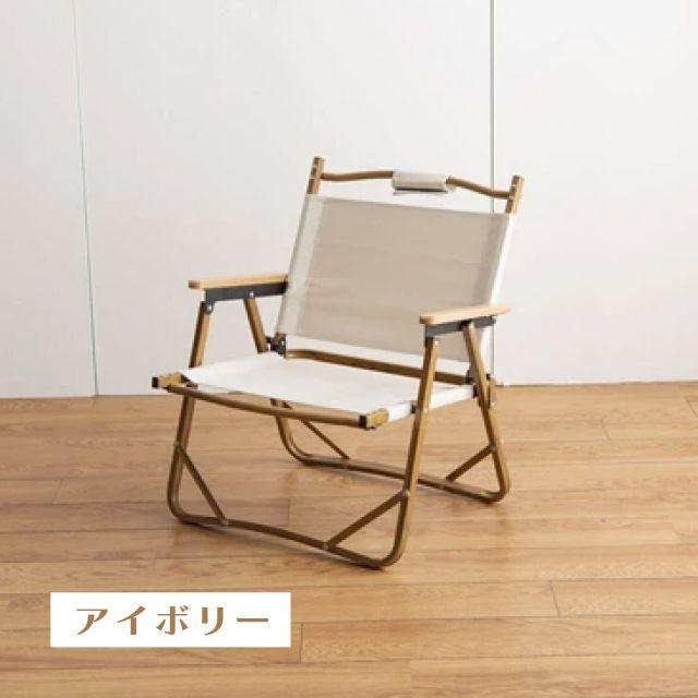 特徴■木目調のアルミフレームと天然木のアームレストがナチュラルな雰囲気を演出する、折りたたみアウトドアチェア。