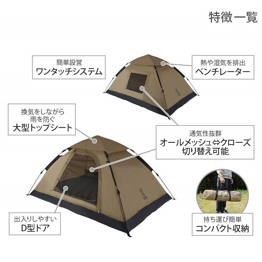 設営・撤収が簡単な寝室用ワンタッチテントです。ポールを組み立てる作業や、テントにポールを通すような作業は一切不要。袋からテントを取り出し、足を広げてロープを引くだけでテントが完成します。気軽にキャンプを始めてみたい、キャンプフェスやツーリングで設営の時間がもったいない、キャンプの時間はできるだけ遊びに使いたい、そんなあなたにぴったりなテントです。シングルウォールを採用し軽量性、取扱いやすさに優れたベーシックモデル。2人でゆったり快適に使用できるサイズ設計、内側から換気調節しやすい大型窓など随所に使いやすさの工夫を施しています。