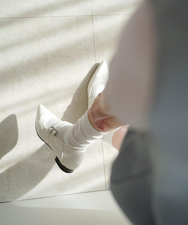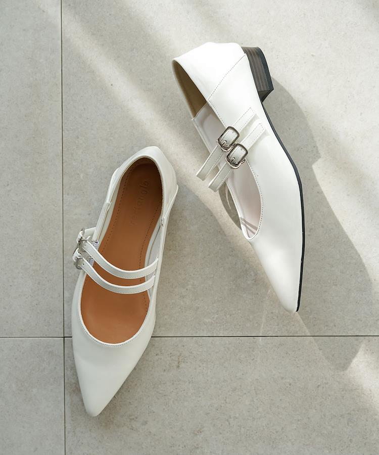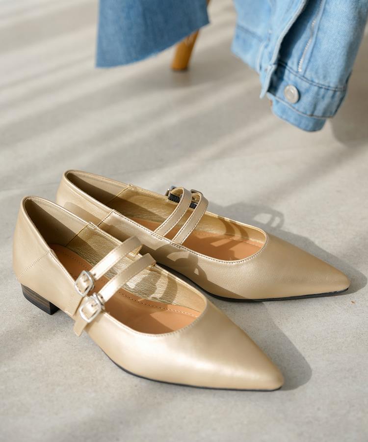 あらゆるシーンに活躍するダブルストラップパンプス1.大人の女性に向けたメリージェーンパンプスシャープなポインテッドトゥと細身のストラップの絶妙なバランスが女性らしい1足。ラウンドの深さや角度も細部までこだわり、足元が美しく見えるラインに仕上げました。2. オールシーズン活躍する艶やかなエナメル生地(ブラック・アイボリー)上品な艶が高見えし、幅広いシーンに活躍!スーツやワンピースを合わせたフォーマルシーンやオケージョンスタイルからデニムやスラックス合わせのカジュアルスタイルまで1足であらゆるシーンに対応。ゴールドは、光りすぎないマットなスムーズ生地を使用。落ち着いた色味ですが、コーデのポイントになってくれるカラーです。3.安定感のあるローヒールとバブーシュ仕様2cmのローヒール。インソールに低反発クッションを入れ、疲れにくい仕様にこだわりました。踵部分を切り替えたバブーシュ仕様になっているので、後ろを踏んでも着用可能です。4.ストラップ2本のストラップで足をしっかりと固定。引っ掛けるだけのフックタイプなので、着脱もラクチン。足幅、甲の高さに合わせてホールの段階調整が可能です。《サイズ感》普段のパンプスサイズと同じサイズ感で問題ありませんでした。厚手の靴下を着用される場合はワンサイズアップされるのがおすすめです。《生産国》中国