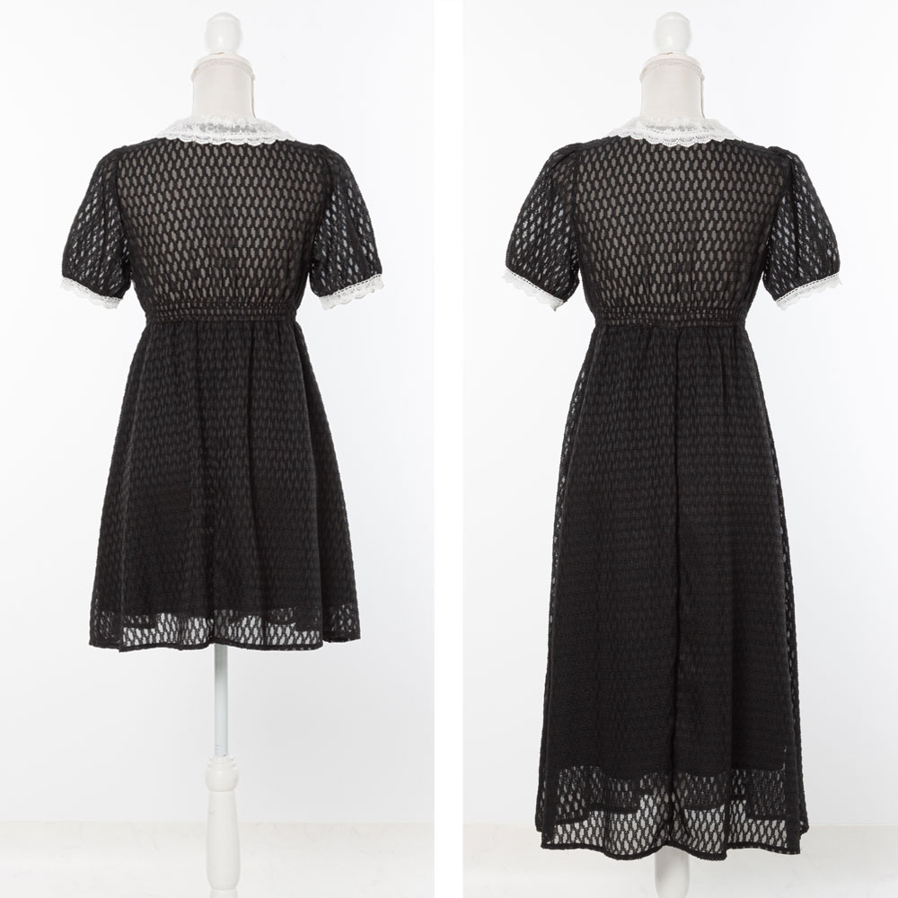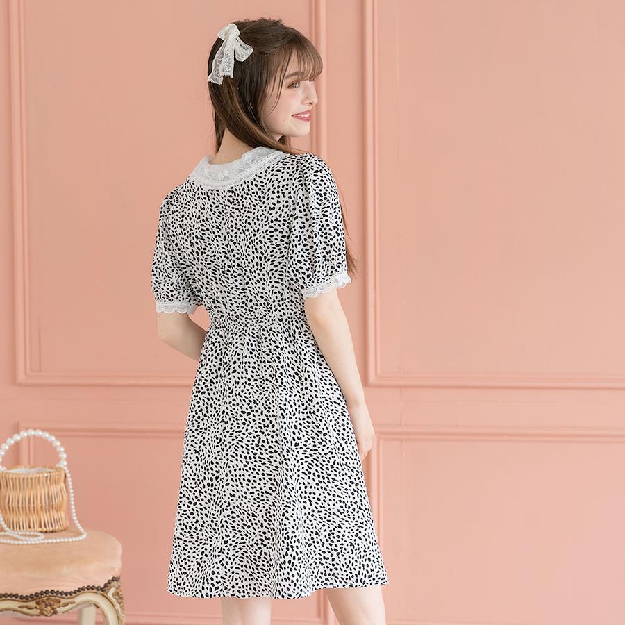 レトロガーリーな雰囲気がかわいいアソート柄ワンピースのご紹介。【デザイン】ヨークと襟のチュールレースやレトロっぽい柄が目を惹く1枚でかわいいワンピースです。ダルメシアン柄、小花柄、ジャガード柄の3つからお好みのデザインが選べるお選びいただけます。ロングorショートから着丈を選んでいただけます。ヨーク部分はお花の刺繍が施されたチュールレースになっていて上品さをプラス。ほんのりデコルテが透けるので抜け感たっぷりです。ウエスト部分はきゅっとしたデザインながら、窮屈感なく着ていただけます。スタイルアップ効果も抜群◎ヨーク部分のボタンを開けて被りで着用いただく仕様で、ウエストのシャーリングゴムはテンションがゆるめなので被りで簡単に着用可能です。