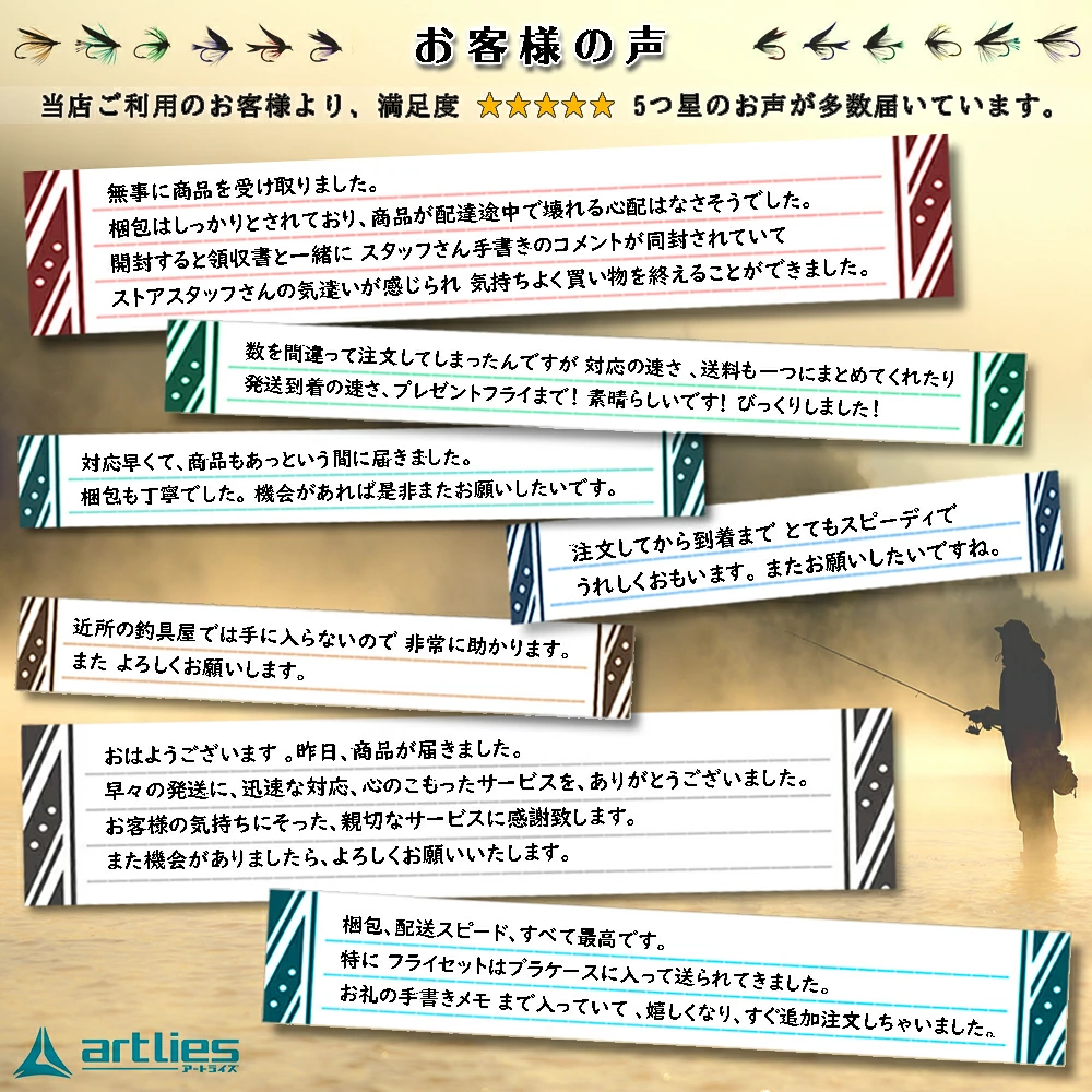 この3つがフライを選ぶ重要なポイントとなります。【重要・確認】フライは天然マテリアルを使用している為、画像とカラーが一致しない事があります。フックはフライパターンによって同一サイズでも大きさが違います。(テレストリアルやバス系はフックが特殊で大きいです)ご了承の上、ご購入ください。