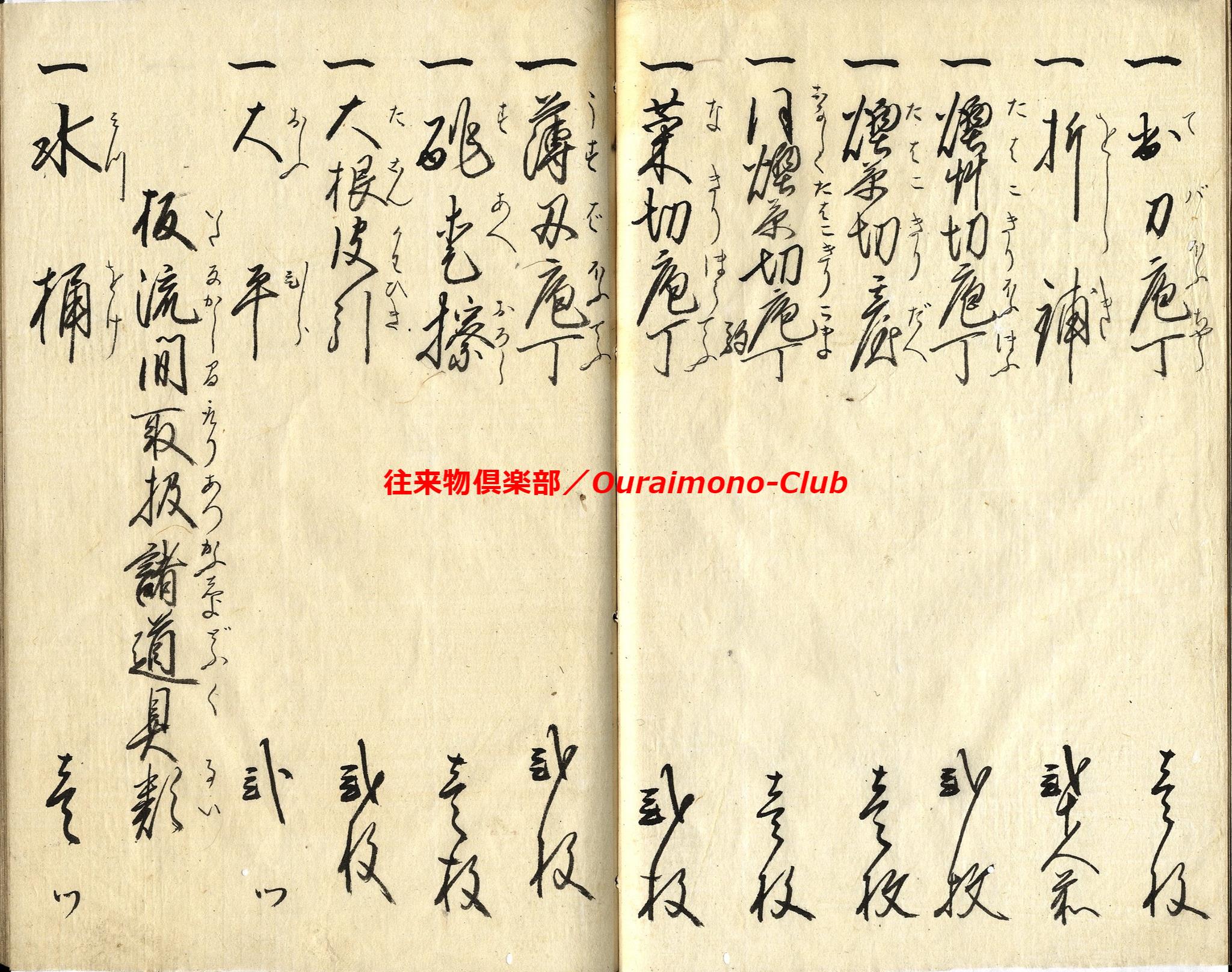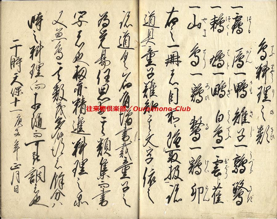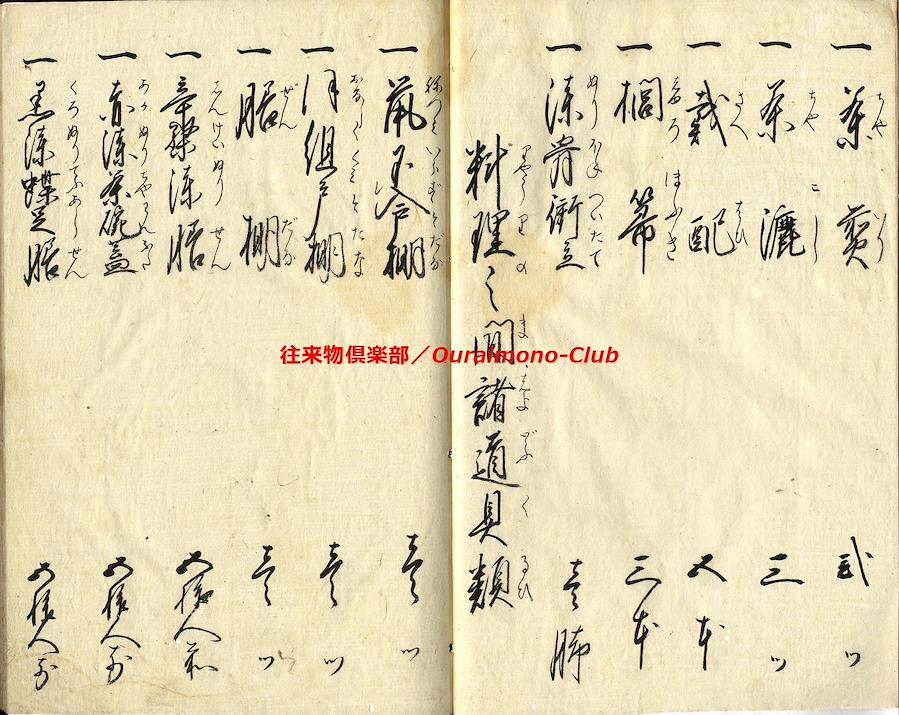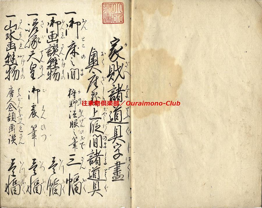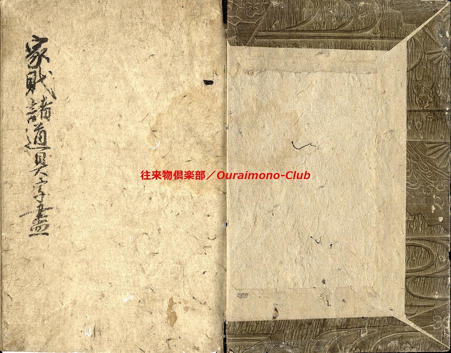 家財諸道具字尽(天保11年)【判型】大本1冊。縦241粍。【作者】花山堂作。毛塚浅吉(花山堂門人)書。【年代等】天保11年1月書。【備考】分類「往来物」。『家財諸道具字尽』は、上流階級の屋敷の間取りを想定して、各部屋毎にふさわしい家財諸道具を列挙し、童蒙教育の一助とした往来。「奥座敷上段間諸道具」「寝所納戸諸道具之類」「勝手座敷諸道具類」「料理之間諸道具類」「板流間取扱諸道具類」「台所取扱諸道具類」「物置部屋諸道具類」「雑穀部屋諸道具類」「献立精進料理品類」「魚鳥料理之類」の10分類で、家財諸道具類の名称とそれに適した数量呼称(単位)を列記する。本文を大字・6行・付訓で記す。