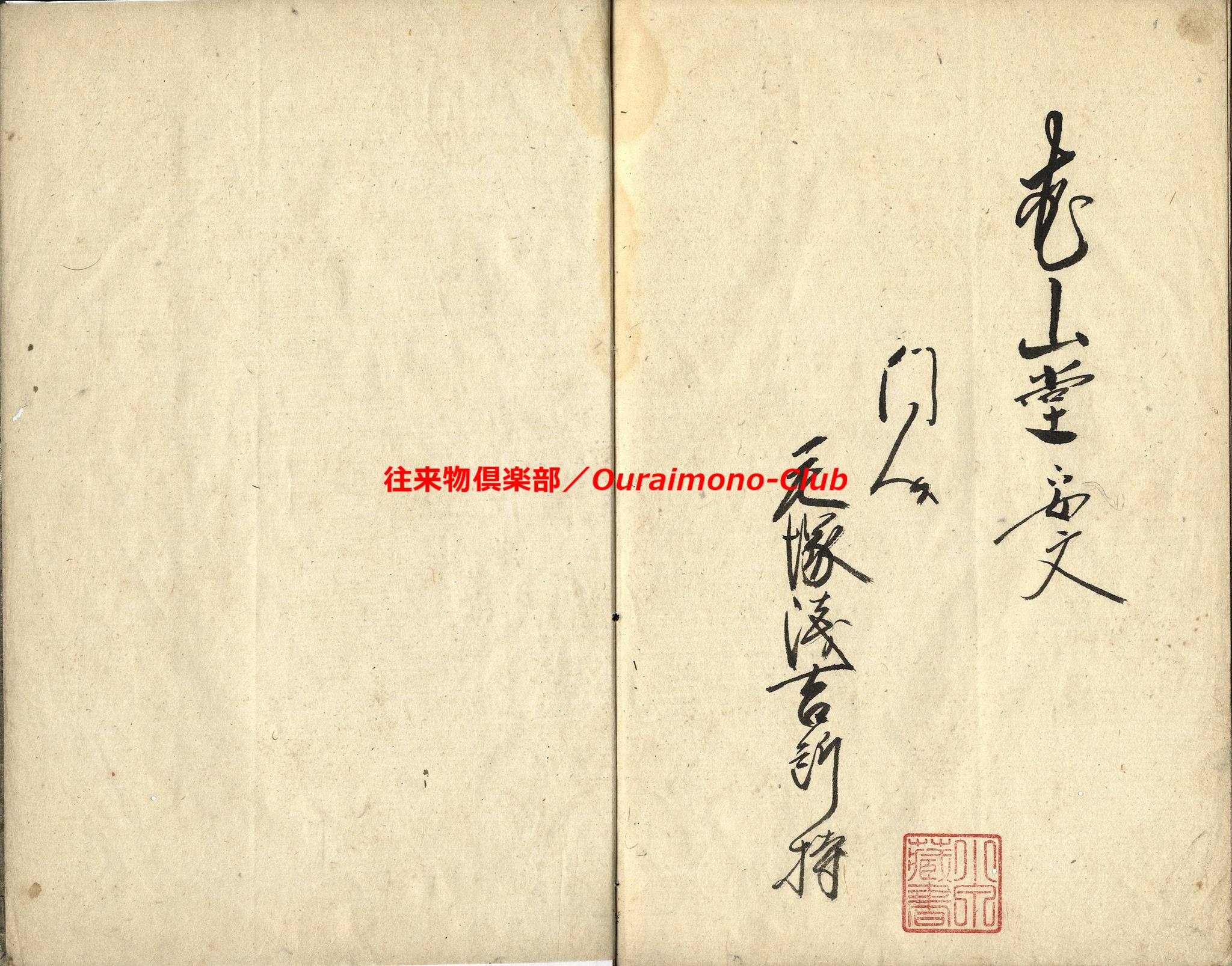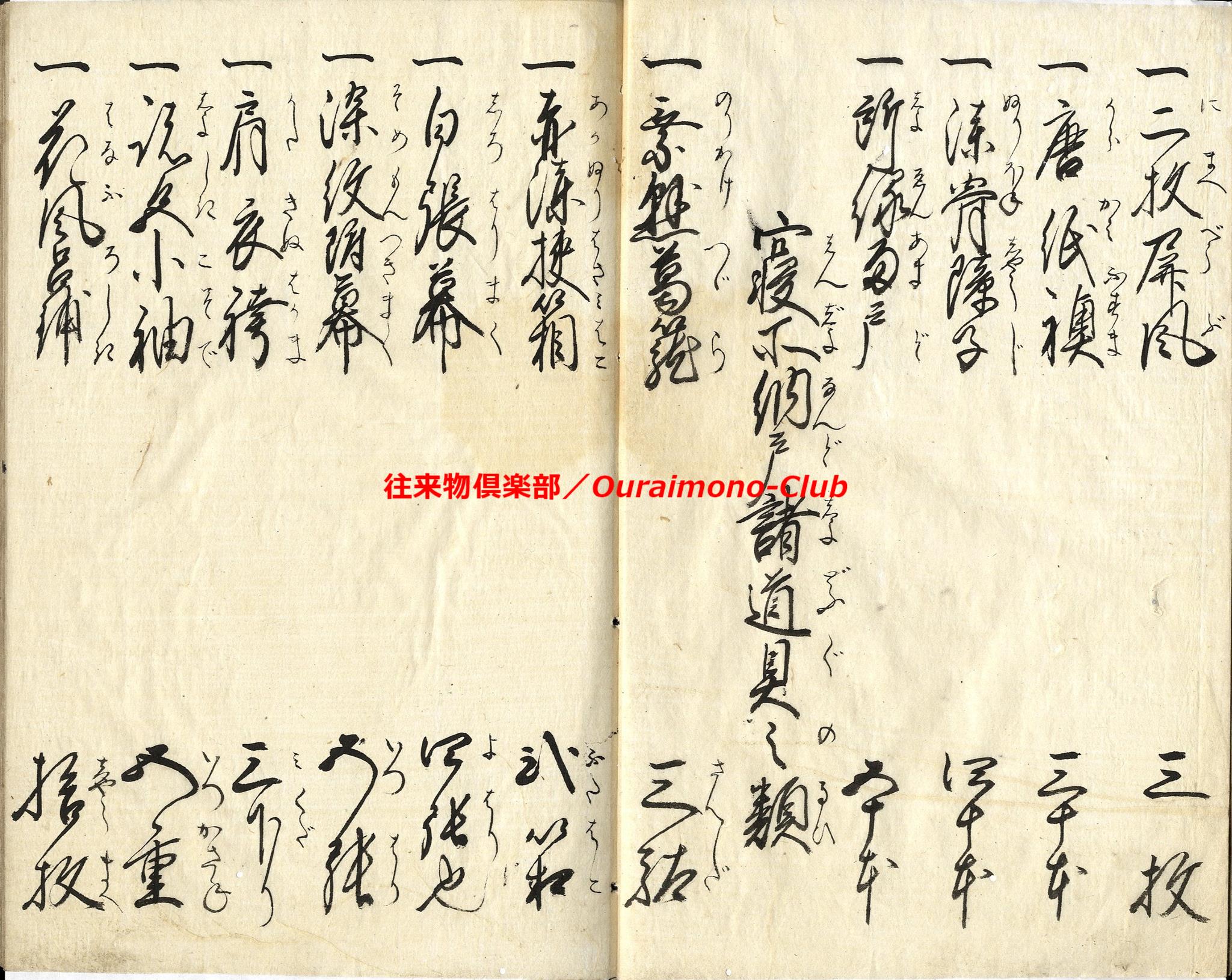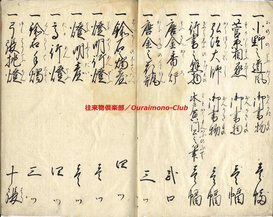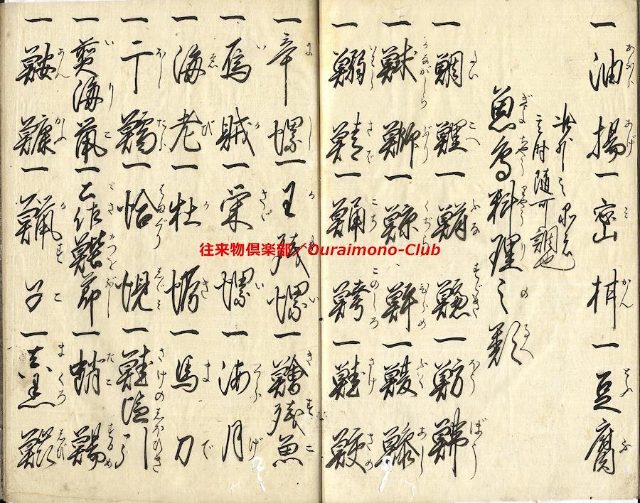 家財諸道具字尽(天保11年)【判型】大本1冊。縦241粍。【作者】花山堂作。毛塚浅吉(花山堂門人)書。【年代等】天保11年1月書。【備考】分類「往来物」。『家財諸道具字尽』は、上流階級の屋敷の間取りを想定して、各部屋毎にふさわしい家財諸道具を列挙し、童蒙教育の一助とした往来。「奥座敷上段間諸道具」「寝所納戸諸道具之類」「勝手座敷諸道具類」「料理之間諸道具類」「板流間取扱諸道具類」「台所取扱諸道具類」「物置部屋諸道具類」「雑穀部屋諸道具類」「献立精進料理品類」「魚鳥料理之類」の10分類で、家財諸道具類の名称とそれに適した数量呼称(単位)を列記する。本文を大字・6行・付訓で記す。