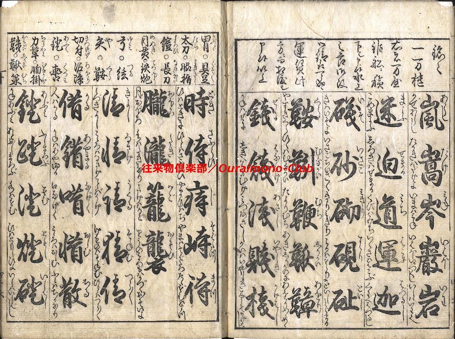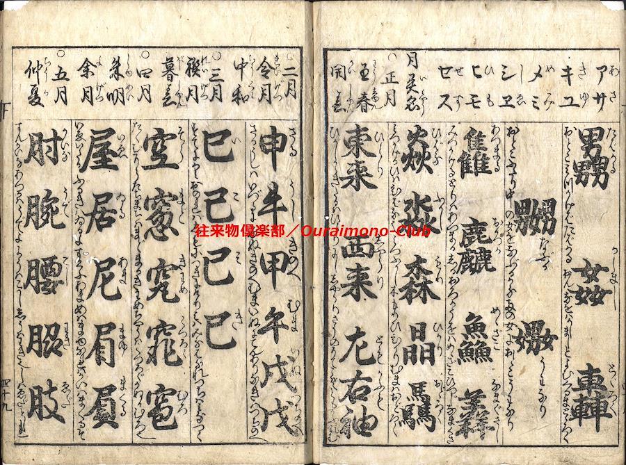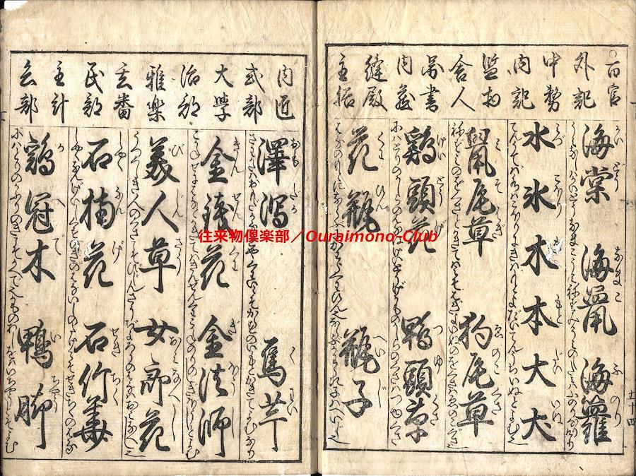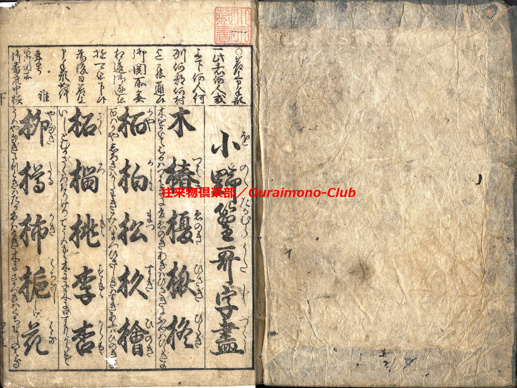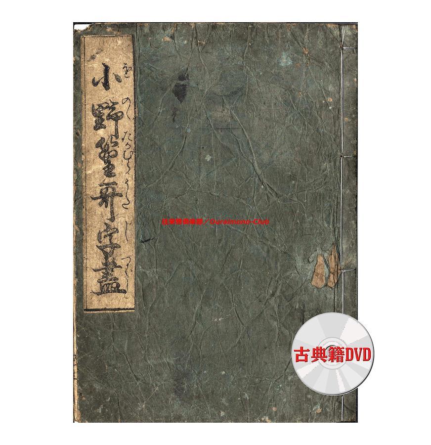 小野篁歌字尽(江戸中期・柱「下巻」)【判型】大本1冊。縦254粍。【作者】不明。【年代等】江戸中期刊。刊行者不明。【備考】分類「往来物」。柱に「下」と記し、丁付けも「四十三」から始まるため、2巻以上から成る先行書からの抄本か。従来「延宝3年板系統」と読んできた「木」本(冒頭が木で始まる)の一つ。寛文2年刊『小野篁歌字尽』の改編本で、寛文板系統と並んで普及した別系統の『小野篁歌字尽』。何らかの意味で類似的あるいは対照的な語彙を1行に並べ(これを仮に1単元と呼ぶ)、これに和歌を添えて記憶の便を図った往来で、内容・構成ともに寛文板と酷似するが、(1)寛文板の第1単元「椿・榎・楸・柊・桐」を本書で「木・椿・榎・楸・柊」に改めた点、(2)寛文板の第64単元(「広・店・庇…」の行)から第87単元(「桶・涌・踊…」の行)までの24単元を、本書では第88単元以後に移動させ、それに替えて寛文板の第89単元(「討・腕・腰…」の行)以下の24単元を挿入した点などが異なる。本系統は寛文11年板を最古として、延宝3年、天和3年板など多くの重板・異板が存する。