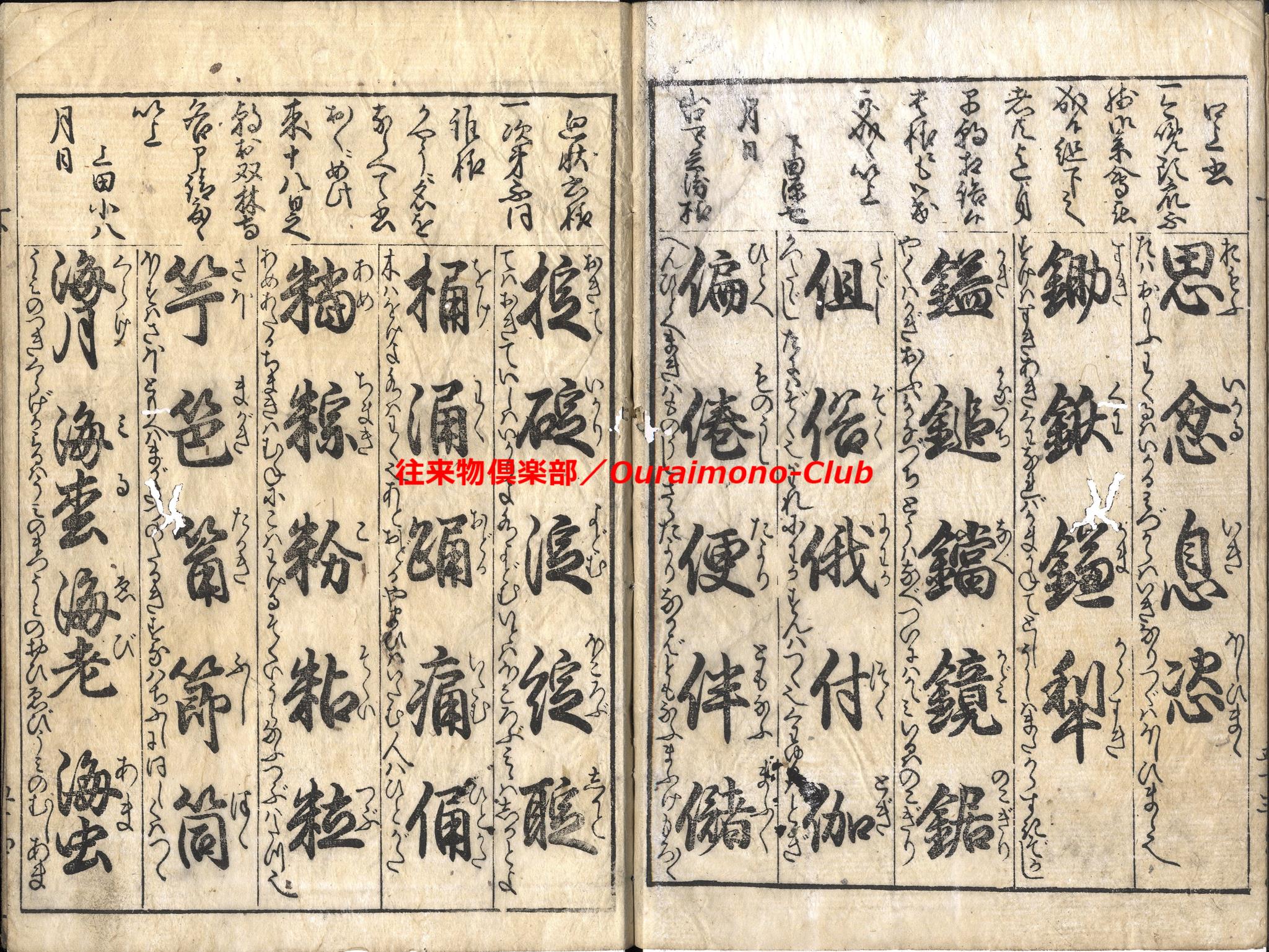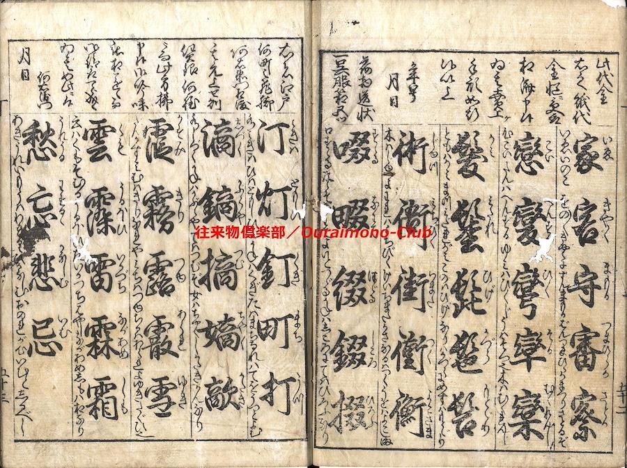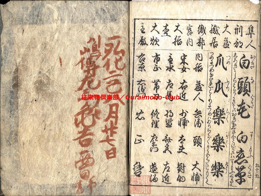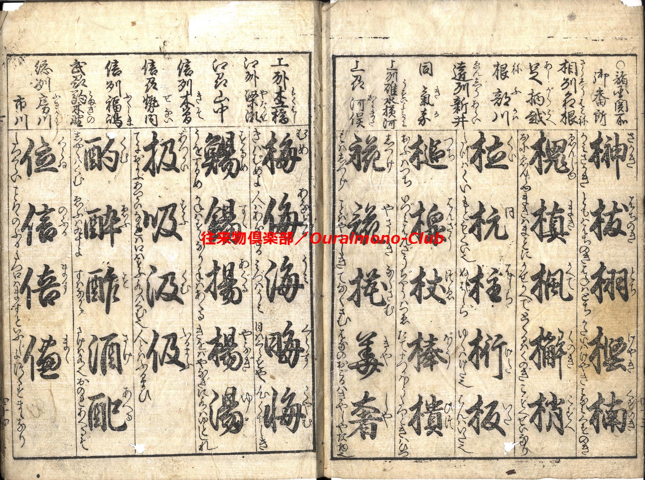 小野篁歌字尽(江戸中期・柱「下巻」)【判型】大本1冊。縦254粍。【作者】不明。【年代等】江戸中期刊。刊行者不明。【備考】分類「往来物」。柱に「下」と記し、丁付けも「四十三」から始まるため、2巻以上から成る先行書からの抄本か。従来「延宝3年板系統」と読んできた「木」本(冒頭が木で始まる)の一つ。寛文2年刊『小野篁歌字尽』の改編本で、寛文板系統と並んで普及した別系統の『小野篁歌字尽』。何らかの意味で類似的あるいは対照的な語彙を1行に並べ(これを仮に1単元と呼ぶ)、これに和歌を添えて記憶の便を図った往来で、内容・構成ともに寛文板と酷似するが、(1)寛文板の第1単元「椿・榎・楸・柊・桐」を本書で「木・椿・榎・楸・柊」に改めた点、(2)寛文板の第64単元(「広・店・庇…」の行)から第87単元(「桶・涌・踊…」の行)までの24単元を、本書では第88単元以後に移動させ、それに替えて寛文板の第89単元(「討・腕・腰…」の行)以下の24単元を挿入した点などが異なる。本系統は寛文11年板を最古として、延宝3年、天和3年板など多くの重板・異板が存する。