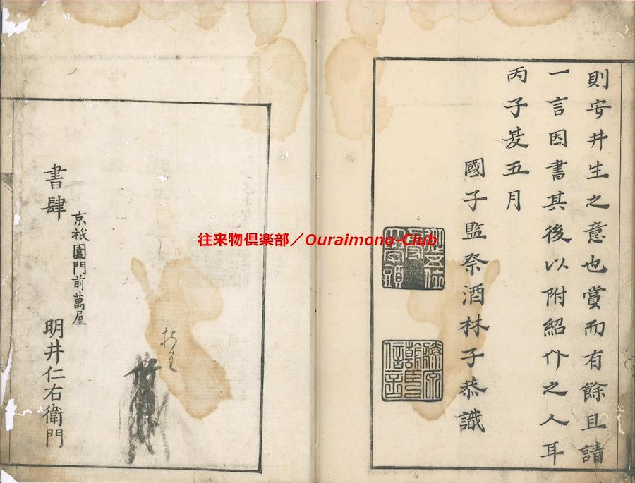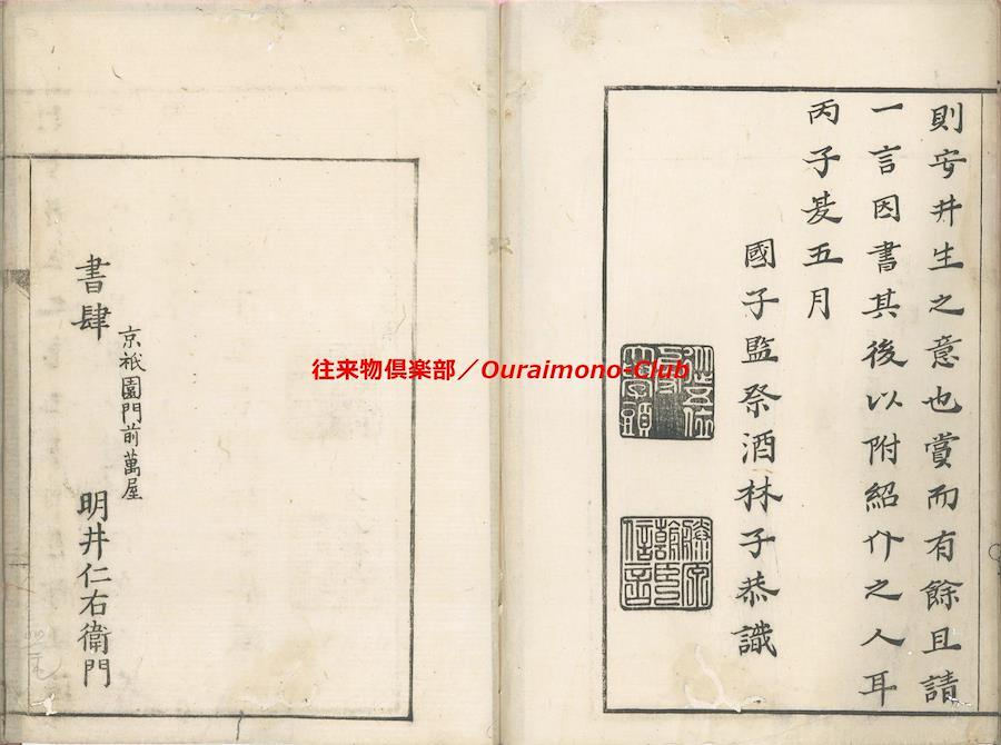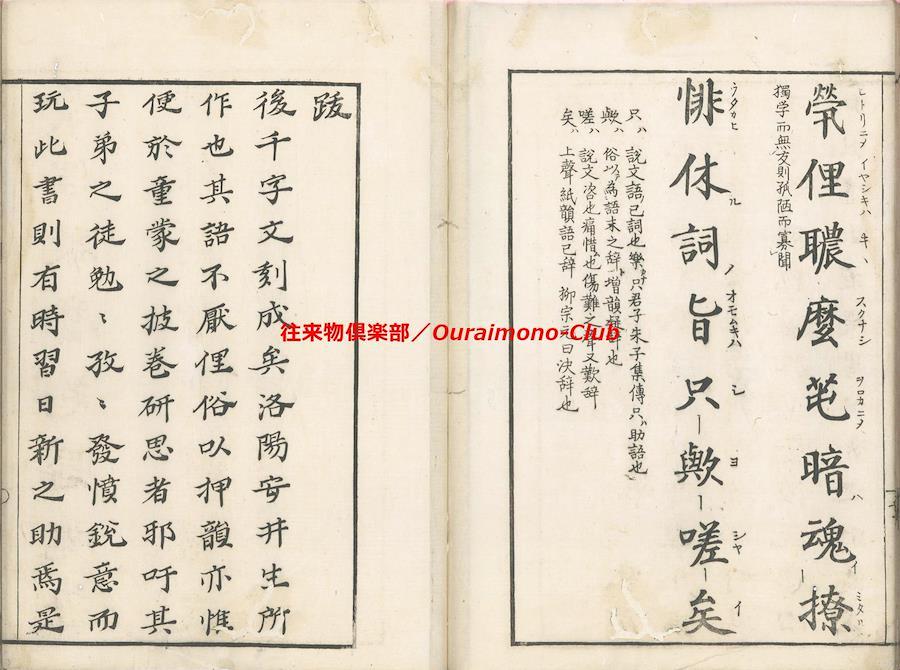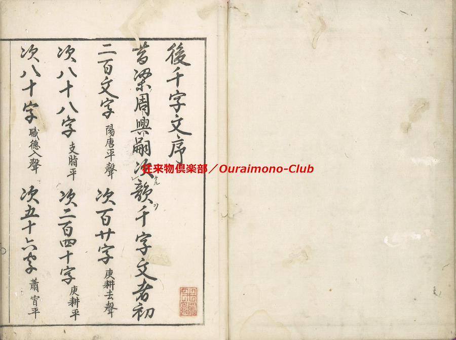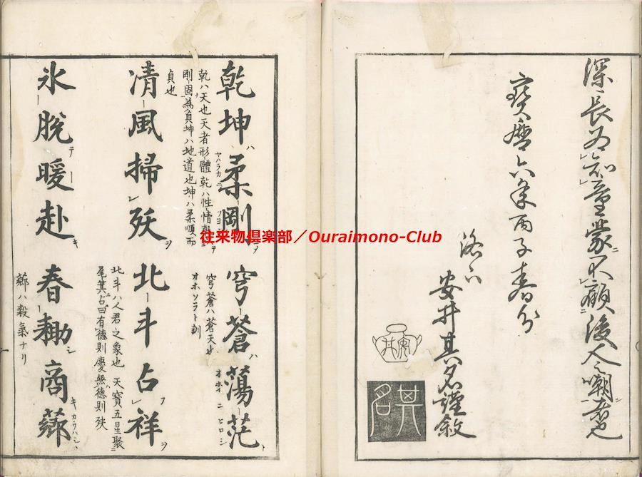 ★後千字文(2種)【判型】大本1冊。収録順に縦264・261粍。【作者】安井其名作・序。林鳳谷(子恭・士恭・松風亭・藤原信言)跋。【年代等】宝暦6年春自序。宝暦6年5月、林鳳谷跋・刊。[京都]明井仁右衛門板。【備考】分類「往来物」。同板別本も抄録した。『後千字文』は、周興嗣『千字文』にならいつつ、同書に未使用の漢字で綴った異本『千字文』の一つ。「乾坤柔剛、穹蒼蕩茫、清風掃殀、北斗占祥…」で始まる文章で、天地、自然、万物、中国古代からの歴史・聖賢・文化、故実、人倫・教誡等を述べる。本文を楷書・大字・3行・所々付訓で記し、各行の左側に適宜注釈を施す。
