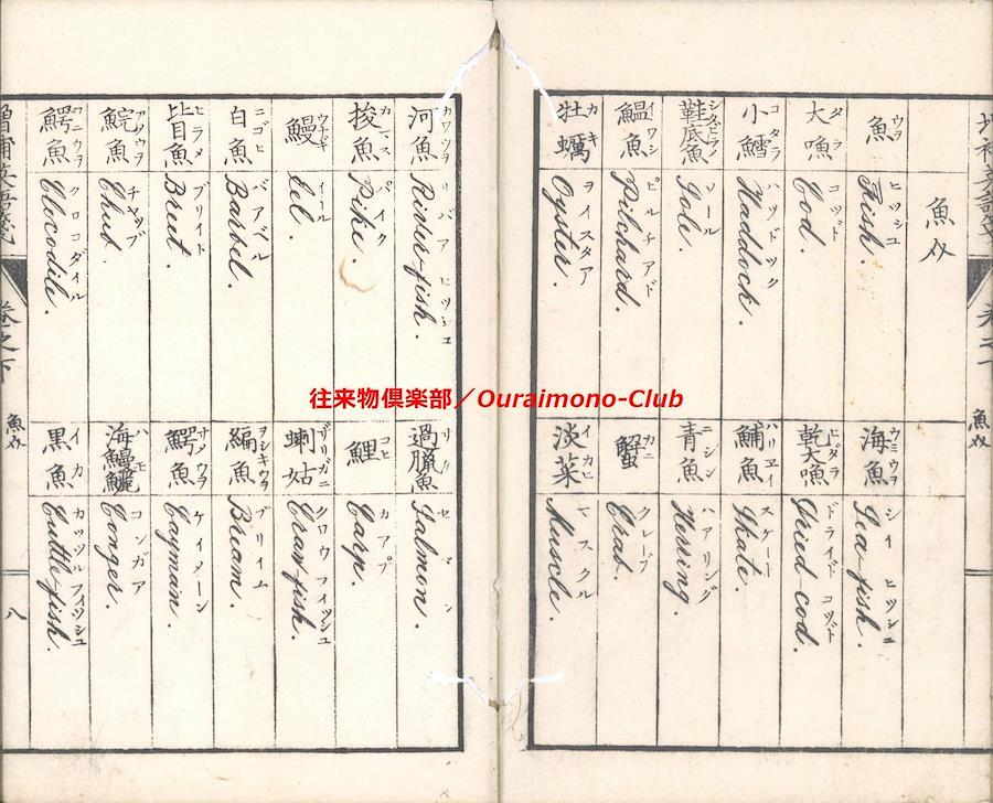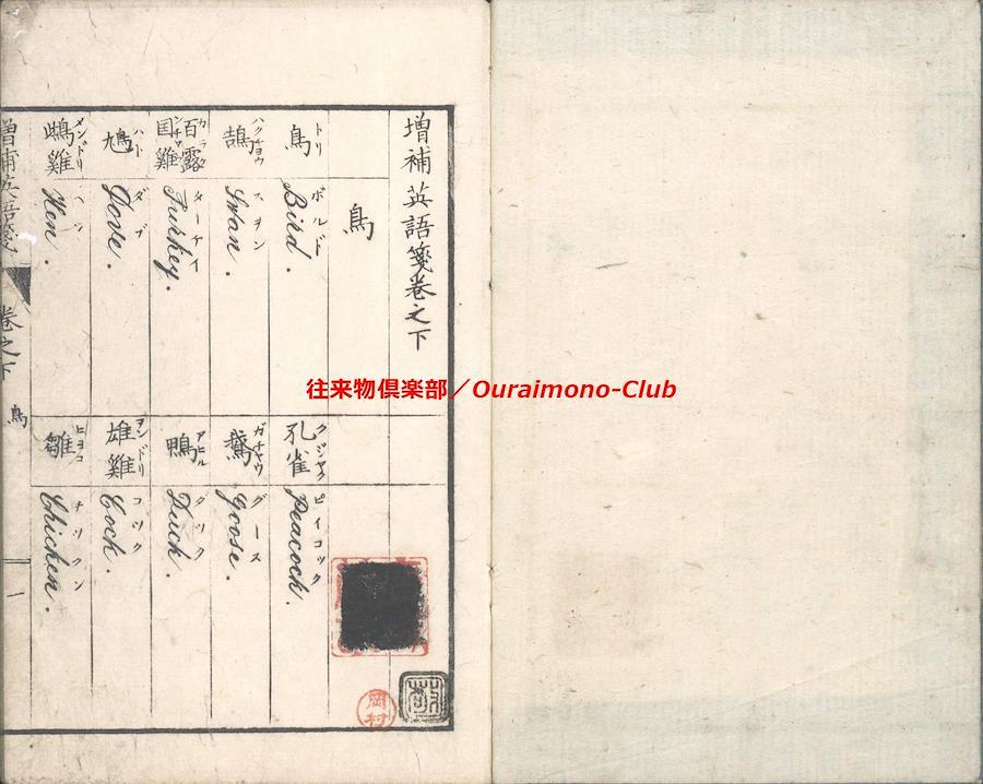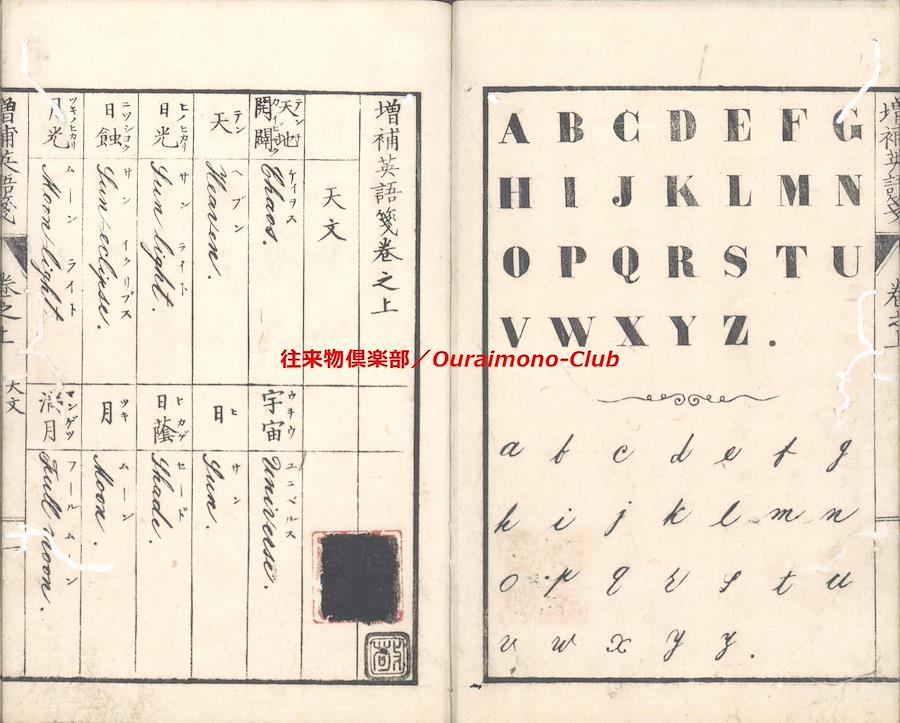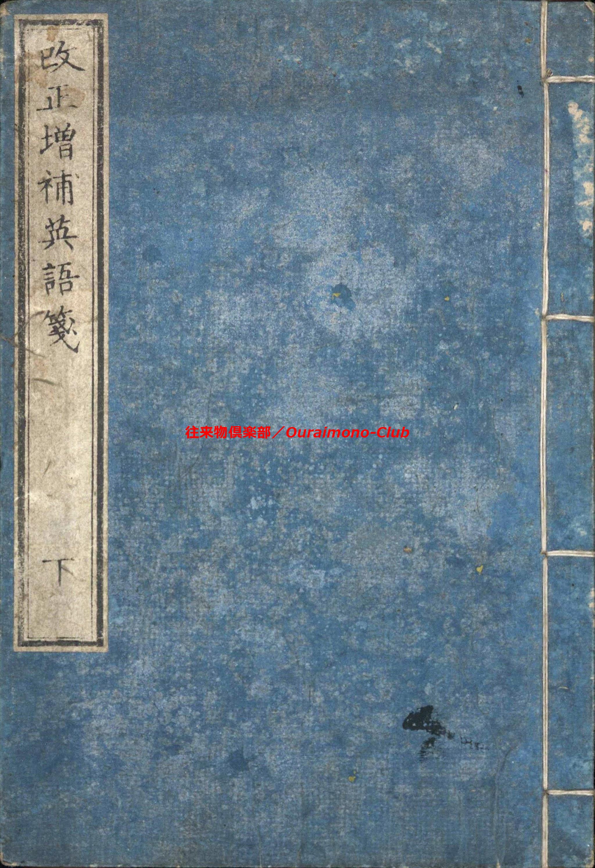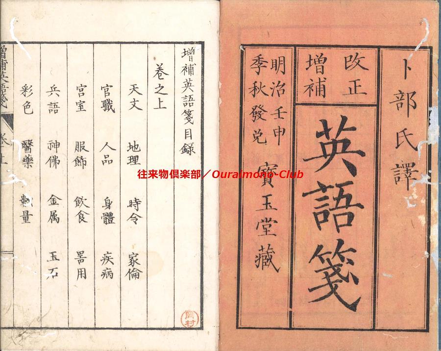 改正増補英語箋[〈改正増補〉英語箋・増補英語箋](明治5年・大阪板)【判型】中本2巻2冊。縦184粍。【作者】卜部氏訳。【年代等】万延2年初刊。明治5年秋増補・再刻。[大阪]河内屋真七ほか板。【備考】分類「往来物・外国語」。明治初年の英単語集。明治5年板に東京板と大阪板の2種あるが、底本は明治5年の大阪板で(櫻井豪人「二つの『改正増補英語箋』における増補について」によれば、大阪板と東京板は個別に編集された可能性が高い)、上巻に「天文」「地理」「時令」「家倫」「官職」「人品」「身体」「疾病」「宮室」「服飾」「飲食」「器用」「兵語」「神仏」「金属」「玉石」「彩色」「医薬」「数量」の19門、下巻に「鳥」「獣」「魚介」「虫」「草」「木」「果実」「言語類(徳不徳・形容詞・副詞・接令詞・前置詞・動詞)」の8門を収録する。なお、上巻巻頭に、イタリック体・ゴシック体のアルファベットを掲げる。また、各英単語は、上下2段・左右7行に罫線で仕切って、まず日本語(漢字)とその読みを記し、次にそれに対応する英単語の綴りと読みを記す。