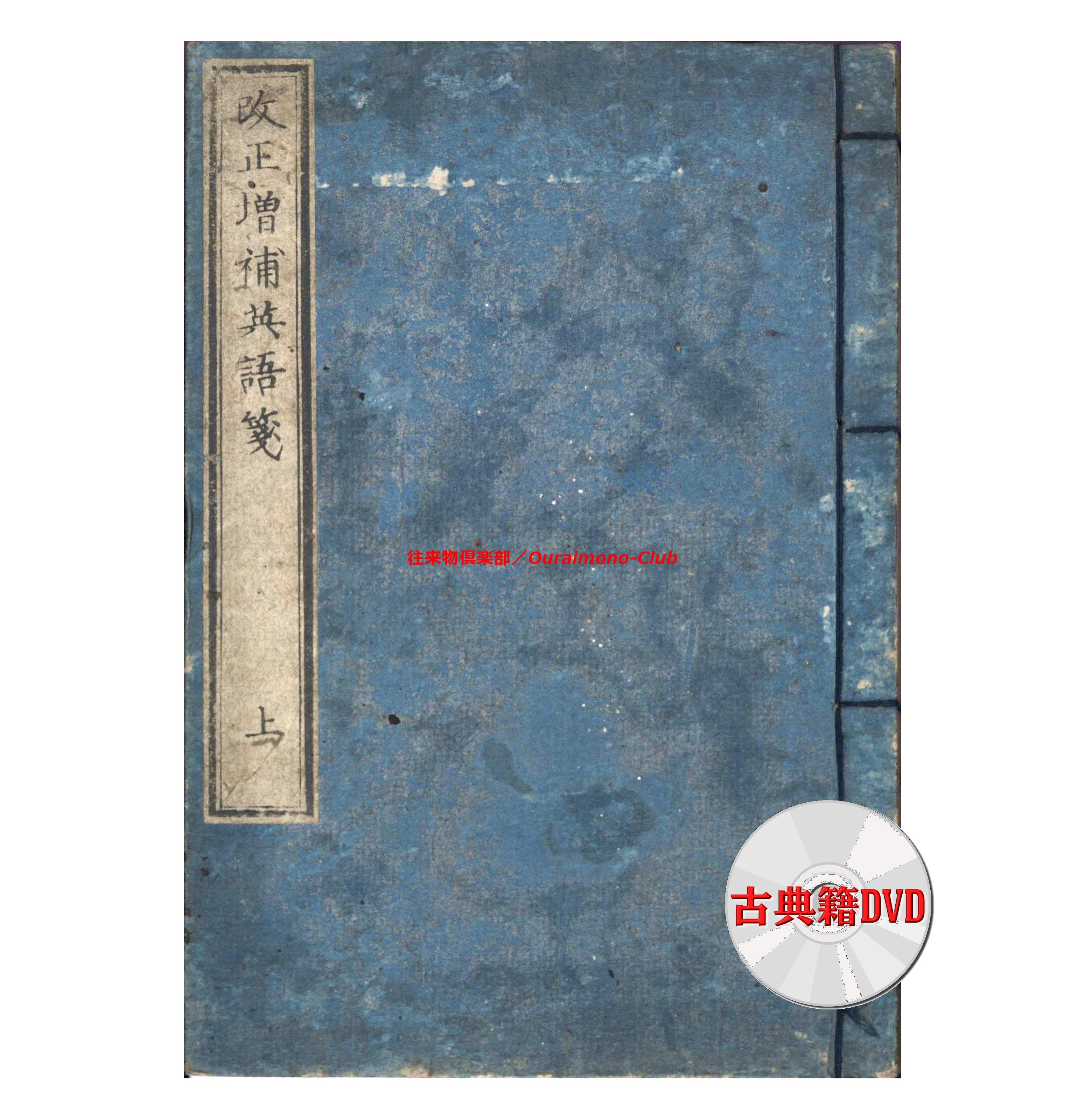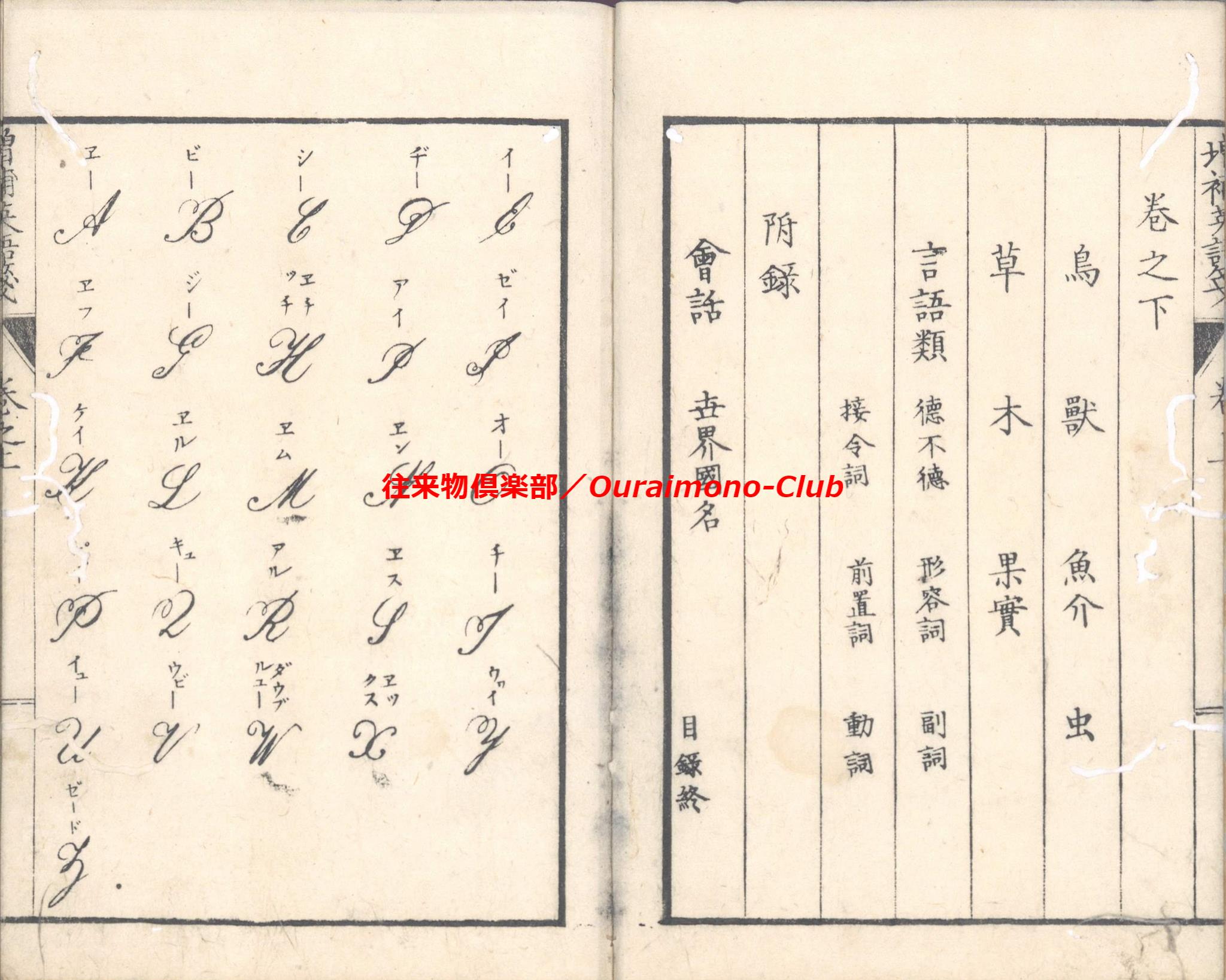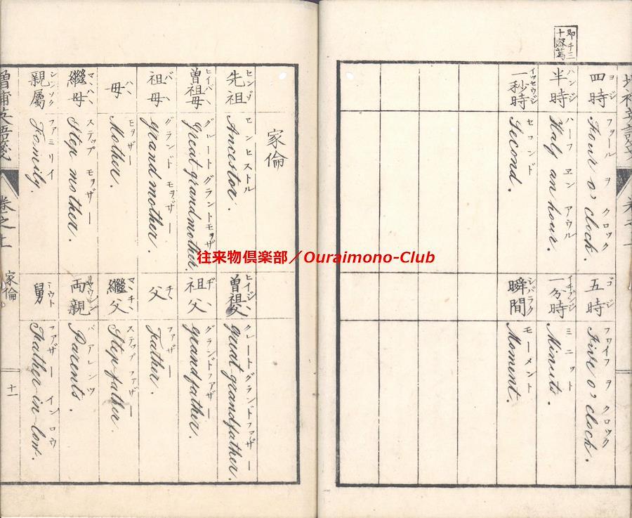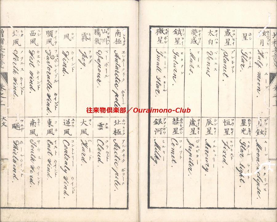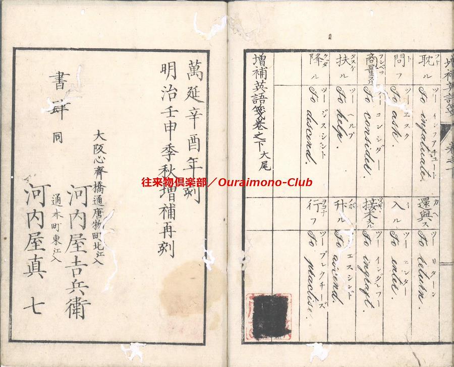 改正増補英語箋[〈改正増補〉英語箋・増補英語箋](明治5年・大阪板)【判型】中本2巻2冊。縦184粍。【作者】卜部氏訳。【年代等】万延2年初刊。明治5年秋増補・再刻。[大阪]河内屋真七ほか板。【備考】分類「往来物・外国語」。明治初年の英単語集。明治5年板に東京板と大阪板の2種あるが、底本は明治5年の大阪板で(櫻井豪人「二つの『改正増補英語箋』における増補について」によれば、大阪板と東京板は個別に編集された可能性が高い)、上巻に「天文」「地理」「時令」「家倫」「官職」「人品」「身体」「疾病」「宮室」「服飾」「飲食」「器用」「兵語」「神仏」「金属」「玉石」「彩色」「医薬」「数量」の19門、下巻に「鳥」「獣」「魚介」「虫」「草」「木」「果実」「言語類(徳不徳・形容詞・副詞・接令詞・前置詞・動詞)」の8門を収録する。なお、上巻巻頭に、イタリック体・ゴシック体のアルファベットを掲げる。また、各英単語は、上下2段・左右7行に罫線で仕切って、まず日本語(漢字)とその読みを記し、次にそれに対応する英単語の綴りと読みを記す。