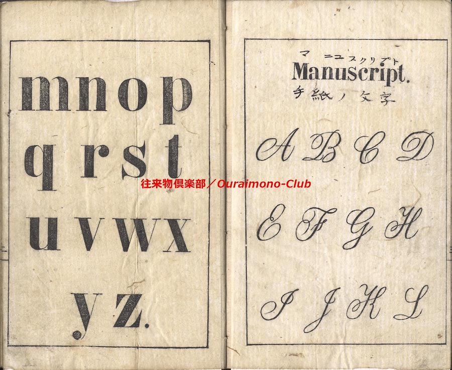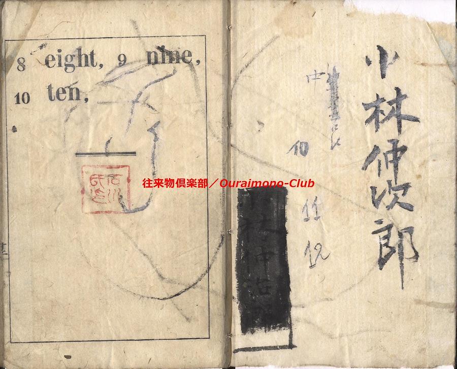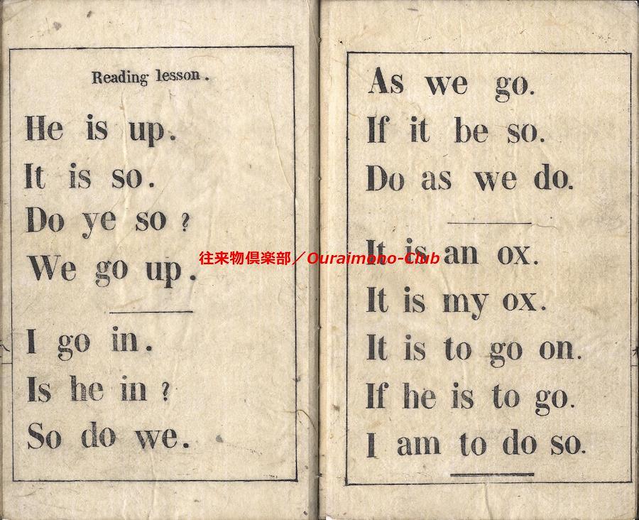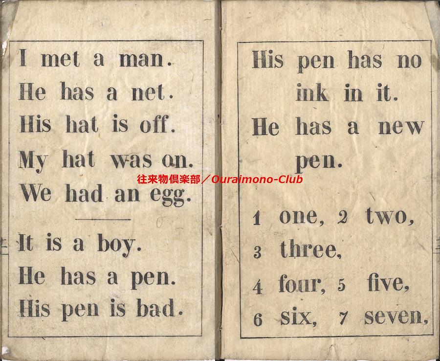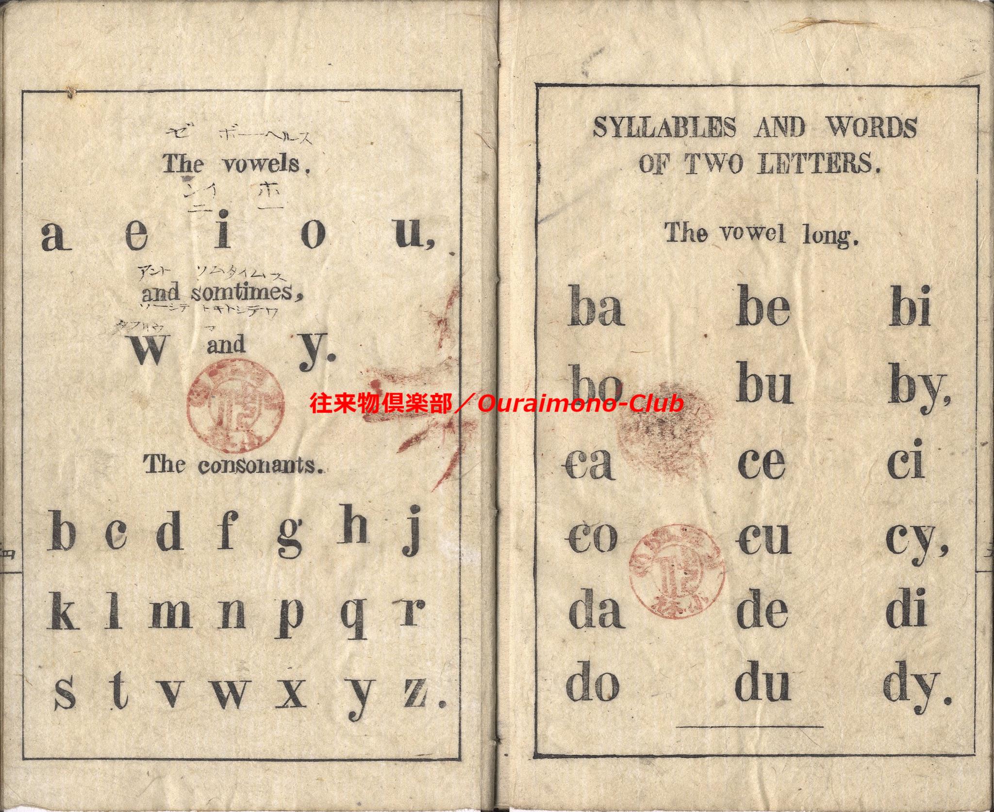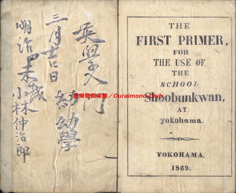 The first primer, for the use of the School(英学入門)【判型】中本1冊。縦178粍。【作者】不明。【年代等】明治2年刊。[横浜]シュウブンカン(Shoobunkwan)板。【備考】分類「往来物・外国語」。見返に「THE FIRST PRIMER.FOR THE USE OF THE SCHOOL Shoobunkwan,AT yokohama. YOKOHAMA.1869」と記し、表紙に「英学入門」の題簽を付すという。家蔵本は題簽欠で、明治4年の書き入れあり。