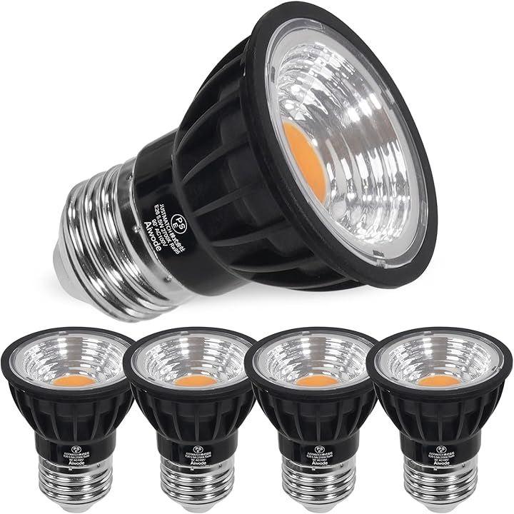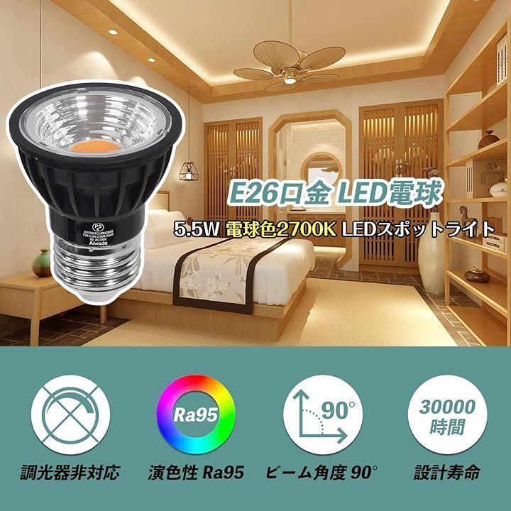 1、演色指数(CRI):95Ra、消費電力:5.5W、全光束:550lm、ビーム角度:90°、色温度:電球色2700K、口金:E26、包装:5個入り、ボディカラー:ブラック、サイズ [外径x長さ]:50mm x 60mm。