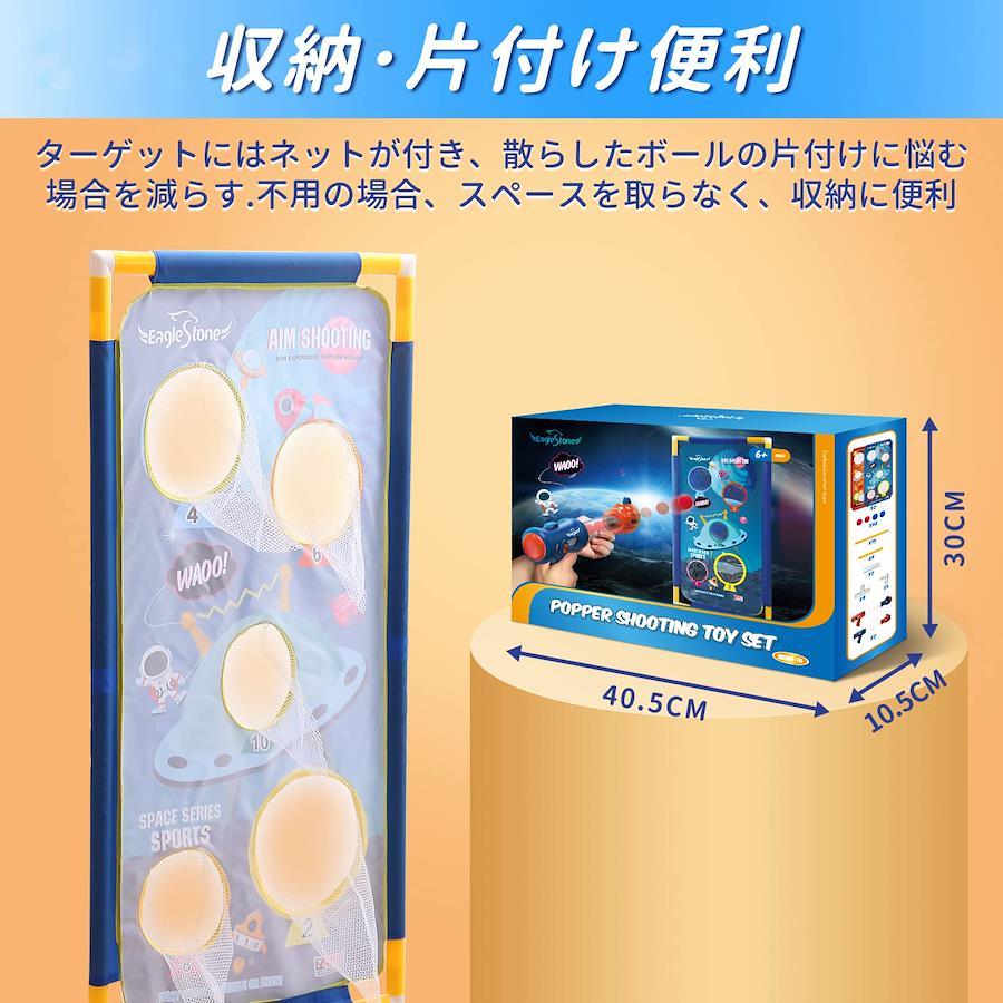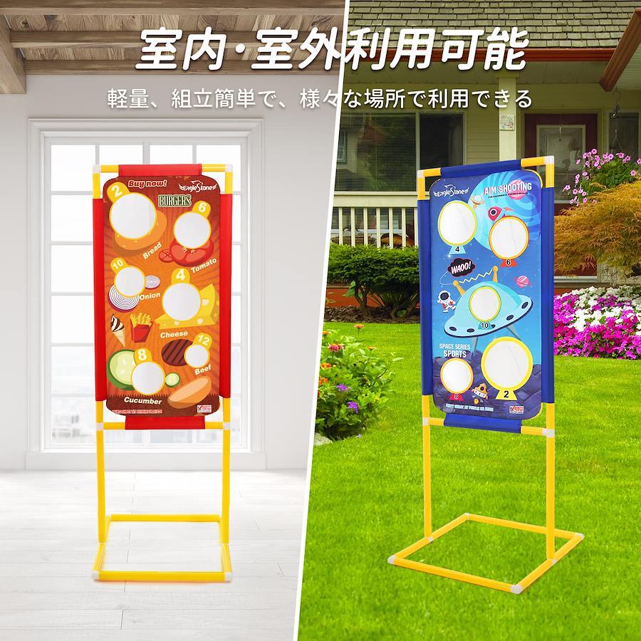 【2テーマターゲット付属】食物テーマと宇宙テーマ、2テーマのターゲットを付属されていますので、違う主題のゲームが体験できます。テーマに応じ、それぞれの主題ルールを作ったり、遊んだりして、子供の想像力も働かせます。例えば、パーティー、ファミリーゲームで、食物テーマターゲットのチーズを当たったら、チーズ1個を食べるこどなど、最大限にプレイアビリティをアップします。誕生日プレゼントに最適な的あておもちゃです。【多様な遊び方が実現できる】ターゲットの穴サイズがそれぞれですので、多種のシューティング道具に適用できます。付属のフォームボールだけではなく、ほかのスポンジ弾、フリスビーなども穴に投げることができます。スポンジ弾をシューティングするか、直接に手でフリスビーなどを投げるか、多様な遊び方が実現可能な射的セットとなります。【収納・片付け便利】ターゲットにはネットが付きで、シューティングしたスポンジ弾がネット内に回収できます。遊んだあと、散らしたスポンジ弾の片付けに悩む場合を減らします。また、製品が折り畳み式ですので、室内/室外でも適用できます。不用の場合、家中の収納スペースを取らなく、収納にも便利です。【48個evaフォームボール】柔軟性、耐摩耗性が高いevaフォームボールを使い、人に当たっても痛くないとともに、家具に当たっても傷が残らないです。【セット内容】主題ターゲット*2、ブラケット*14、フォームボール*48。【免責事項】メーカーによる商品リニューアルに伴いパッケージ(内容量も含む)変更が行われた場合、新パッケージでお届け致します事ご了承願います。