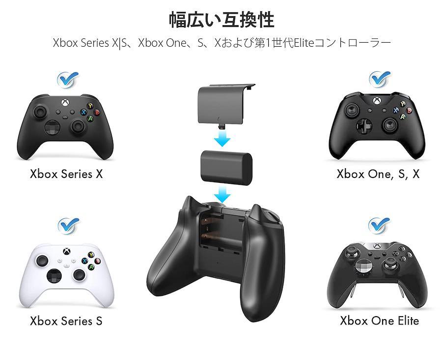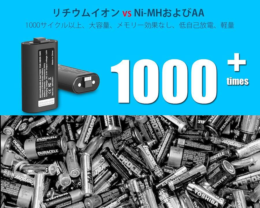 2pcs Li-ion Rechargeable Battery Pack for Xbox ControllerUse Xbox Series X|S and Xbox One Wireless ControllerWhen fully charged in 3 hours, you will get 35 hours of continuous playback time.On-screen display battery level and pop-up low level notificationOver 1000 cycles, no memory effect, low self-discharge lithium-ion cellsPlay and charge at the same time, no charger dock needed2 x 1.5 meter data and charging cable with real-time LED indicatorsBuilt in BMS and CE, FCC and RoHS certified to ensure safety.Model: MRX0201Compatibility:Xbox Series X, Xbox Series S, Xbox One, Xbox One S, Xbox One X, and 1st Generation EliteCell Type: Li-ionCapacity: 2 x 1,200 mAh / 4.2 WhCharging Current: 500mAOutput Voltage: 3.0VFull charge: 3 hoursDuration: 15-35 hoursColor: Black.Weight: 25gUSB Cable: 2 x 1.5mConnector: USB Type-A to Micro-USBAdapter: Micro-USB to USB CLED Color: Orange is charging, white is fully chargedPackaging:2x Battery Pack (1200mAh)2x USB Cable2x USB Adapter(Note: Xbox controller and battery cover are not included) [Xbox Li-ion Battery] - High capacity, 1000+ recharge cycles, no memory effect, low self-discharge, light weight, environmental friendly. Lithium-ion rechargeable batteries outperform disposable AA batteries or older NiMH NiMH batteries. 1200mAh rechargeable battery pack with built-in polymer Li-ion cells compatible with Xbox Series X and S, Xbox One, One S, One X, 1st Generation Elite Remote Control [CHARGE & PLAY] - Simply wire the USB charging cable and your Xbox battery will be charged when you play your favorite gaming session. Fully charged within 3 hours and lasts up to 35 hours of battery life per cycle. No charging dock needed like the rechargeable battery on other Xbox controllers. No need to remove the battery frequently for charging [Versatile USB Cable] - 2 pack 1.5 meter USB cord with specially designed LED light to indicate charging status. Orange is charging, but white is fully charged. Data link function shows real-time battery status on video TV screen. It can also be a universal cable to connect your Xbox controller to your Windows PC. The included additional adapter (Micro-USB to USB Type C) works with the latest Xbox Series X/S controllers [OSD Battery Status] - When 4 small gold connectors transfer data to the controller, the Xbox will display energy levels in real time, when the level is very low and the warning message pops up and prompts will be displayed. Plug the cable for next charging [BMS SAFE CHARGING] - FCC, RoHS and CE certified Xbox rechargeable battery pack ensures safety in daily use. Battery management system IC built in the control panel provides intelligent charging, over-voltage, over-current, over-discharge protection. Built-in temperature sensor prevents further damage in case of accidental