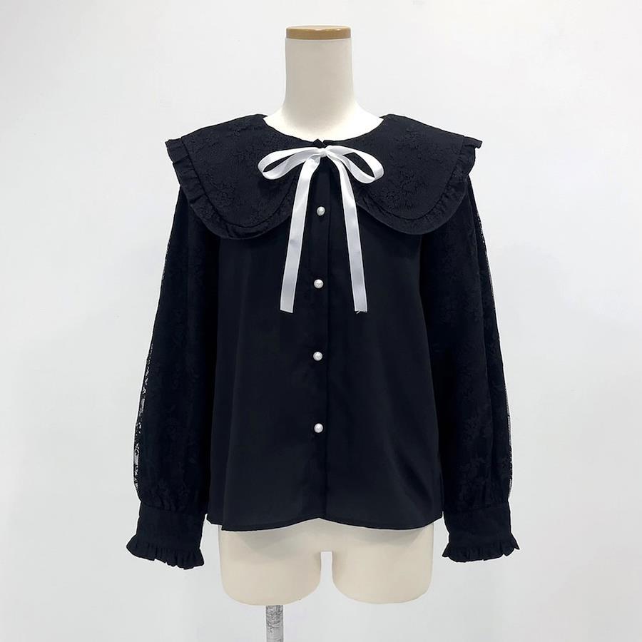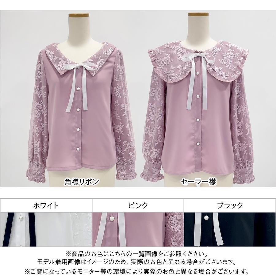 上品なレースが可愛い襟が選べるブラウスのご紹介。【デザイン】襟と袖に重なったレースがポイントのブラウスです。角襟とセーラー襟の2種類から襟タイプをお選びいただけます。付属のリボンタイは取り外し可能で、ご自身で結んでいただく仕様です。袖のカフスはボタン式になっていますが、ボタンを外さなくてもすっぽり着ていただける嬉しいサイズ感です。前立てとと袖カフスのパールボタンが上品見えするデザイン。前ボタンを開けて着脱する仕様なのでヘアアレンジした後でも着用いただけます。シンプルでどんなコーデも合わせやすいデザインなので、1枚持っていると着回し抜群なアイテムです。