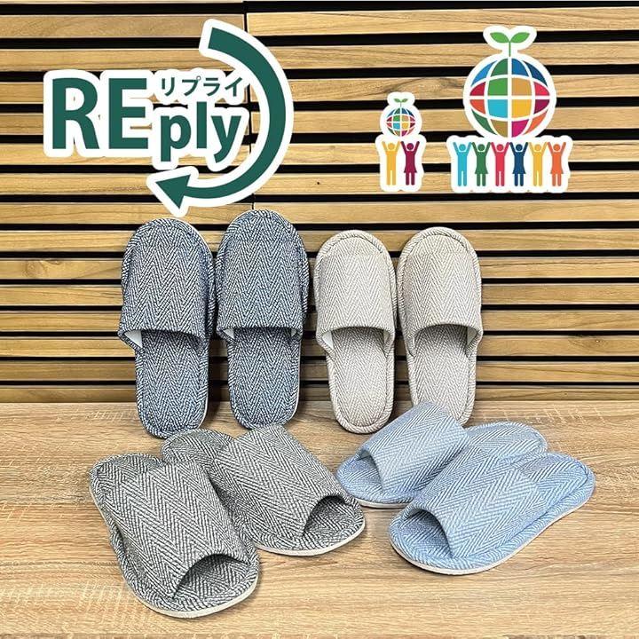 回収された廃棄プラスチックを原料とした再生ポリエステルを表の生地に使用したサスティナブルなスリッパが登場しました。