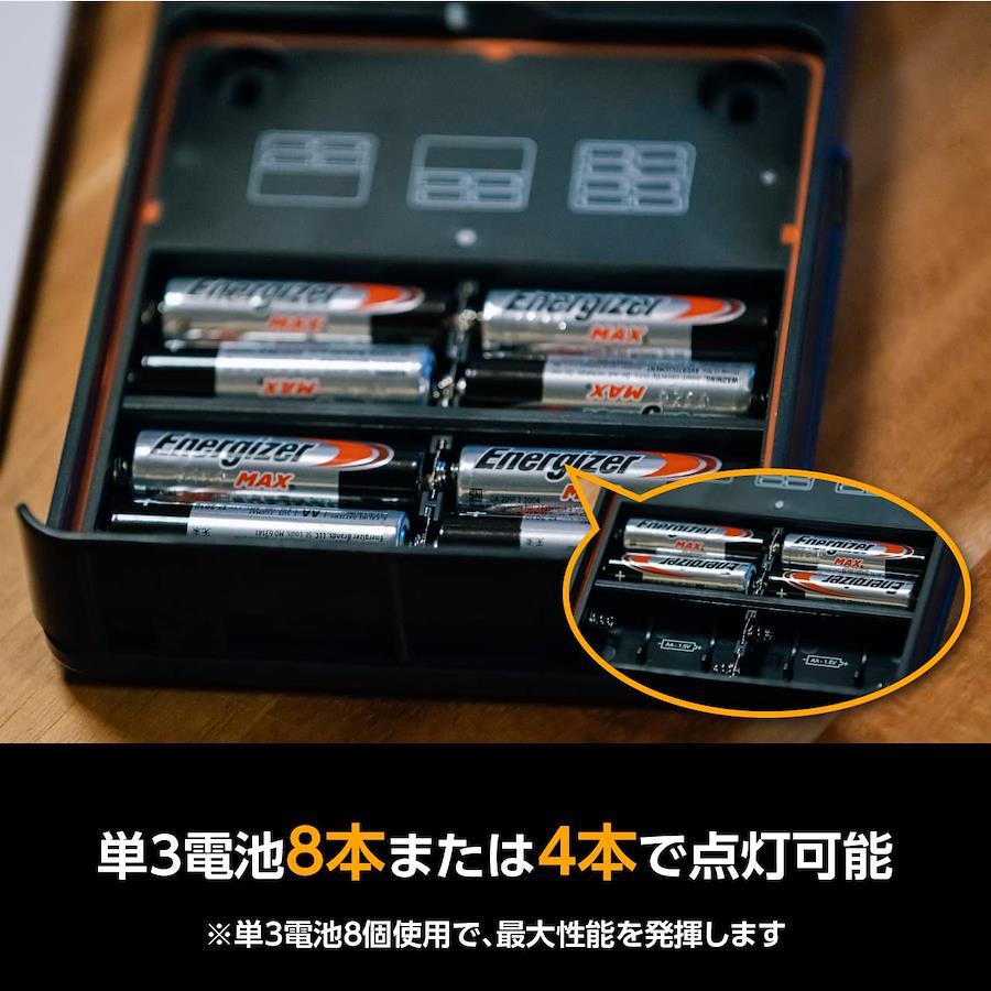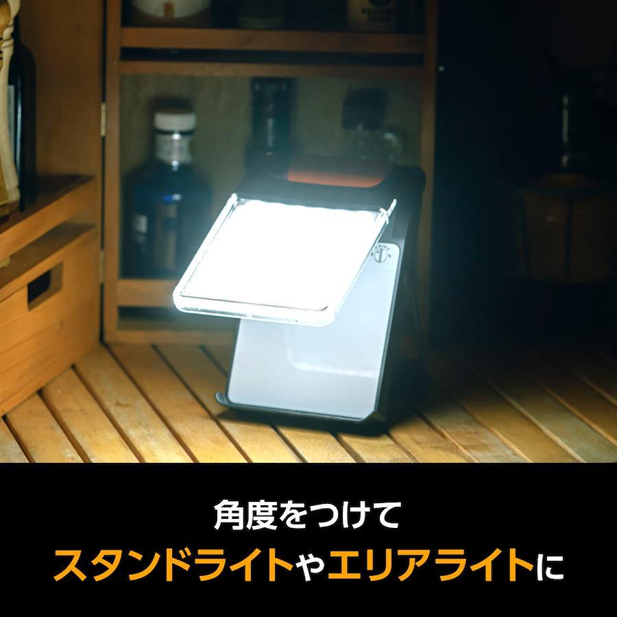 背面スタンドで自立設置。360℃照射可能。ハイ、ローモード切替明るさ最大400lm点灯最大時間100時間(ローモード、電池8本使用時)背面スタンドで自立設置可能IPX4対応防水360℃照射可能
