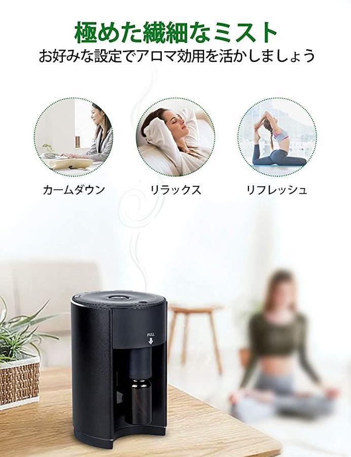「アロマそのまま・エレガント空間を実現」ネブライザー式のアロマディフューザーは水、熱を使わないでそのままエッセンシャルオイルを空気微粒子に変換し程よく均等なミスト量が広がらせて、瞬時に香りが満たし、室内に快適な香りを保つことができます。