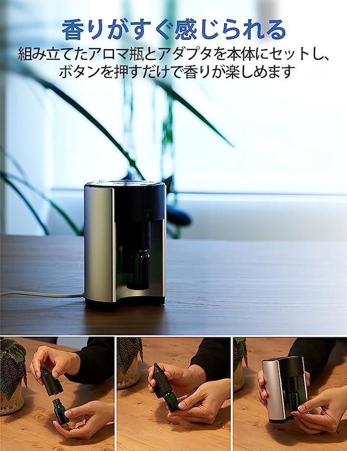また、アロマの瓶は外から残量わかりやすく見えて、わざとディフューザーを止めて、アロマ瓶を取り出して確認する必要はございませんので、便利です。